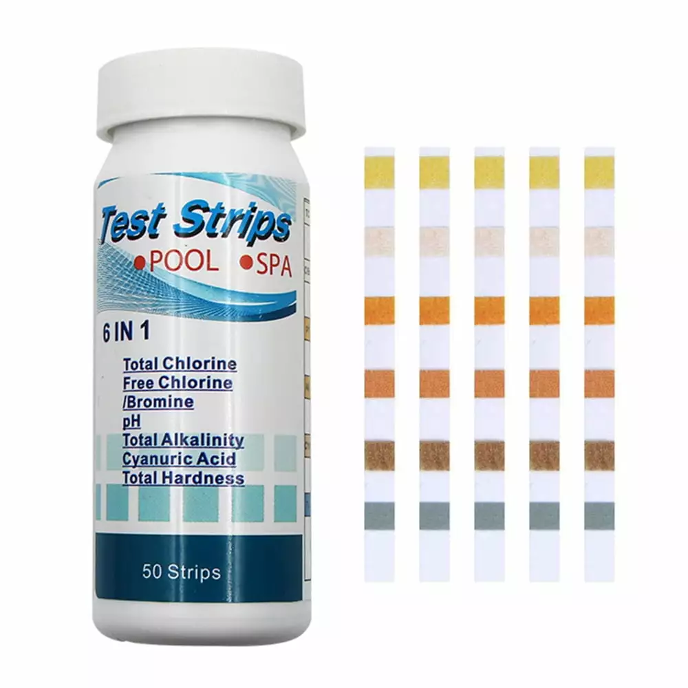 6-Way Spa Test Strips for Hot Tub. 50 Counts. Hot Tub Test Strips for Chlorine. Bromine. pH. Alkalinity. Cyanuric Acid and Hardness Levels in Pool and Spa. Test Kit for Pools