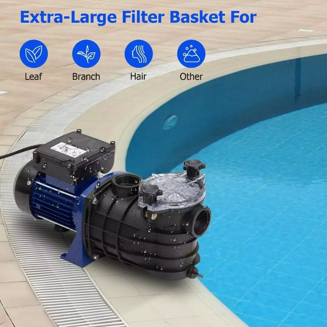 - Humanized Design: The swimming pool pump includes a convenient drain plug at the bottom for easy drainage and to prevent water accumulation during winter. simplifying pump maintenance. The extra-large filter basket with a clear cover minimizes pool upkeep. while the transparent cover allows for easy monitoring of the basket’s cleanliness.