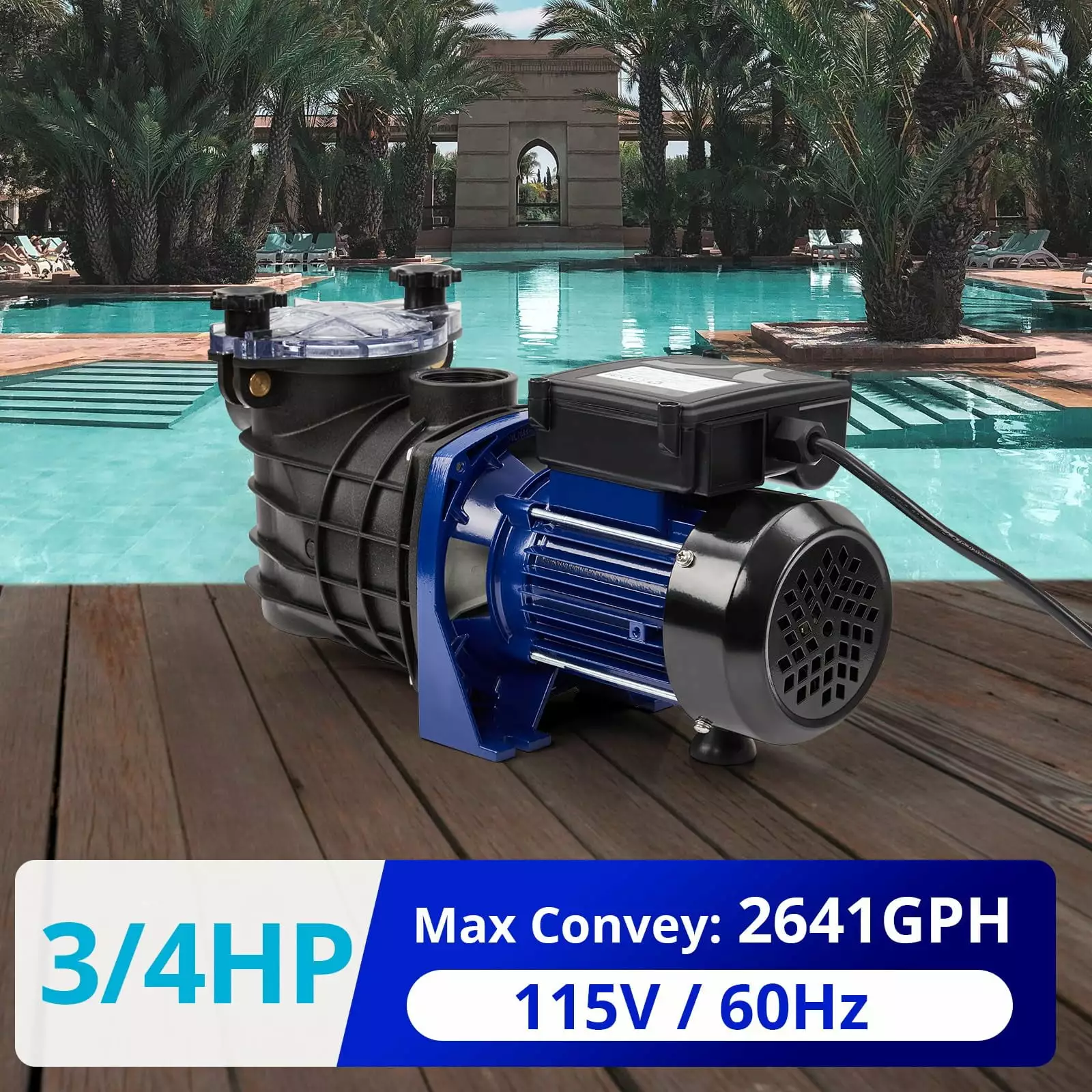 - ??Efficient Performance??The 550W 3/4HP pool pump has built-in thermal overload protection and provides pressure and the powerful flow can achieve 2641GPH and the maximum suction height can reach 36ft.
