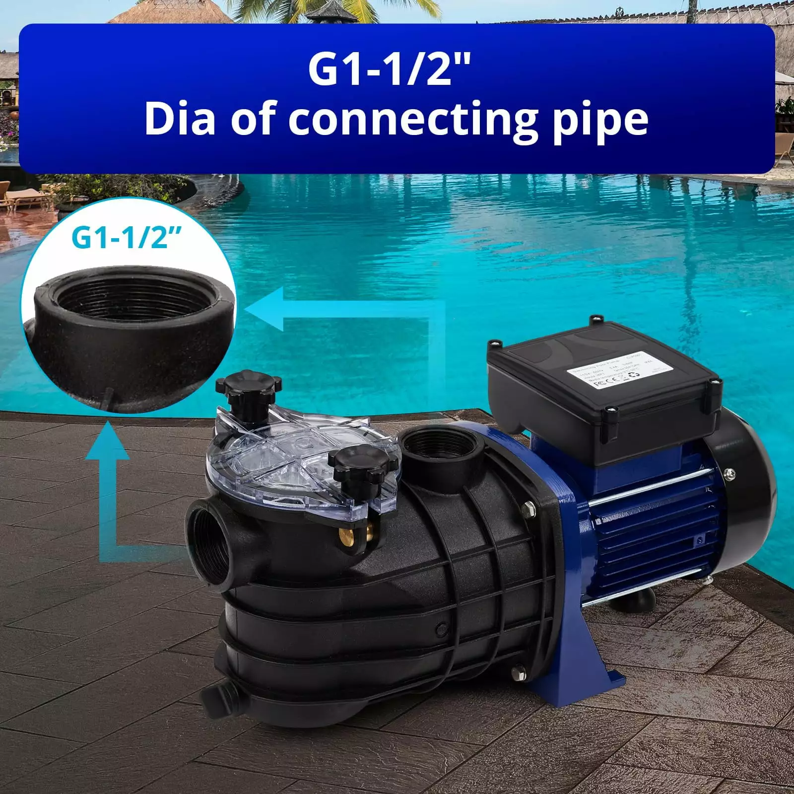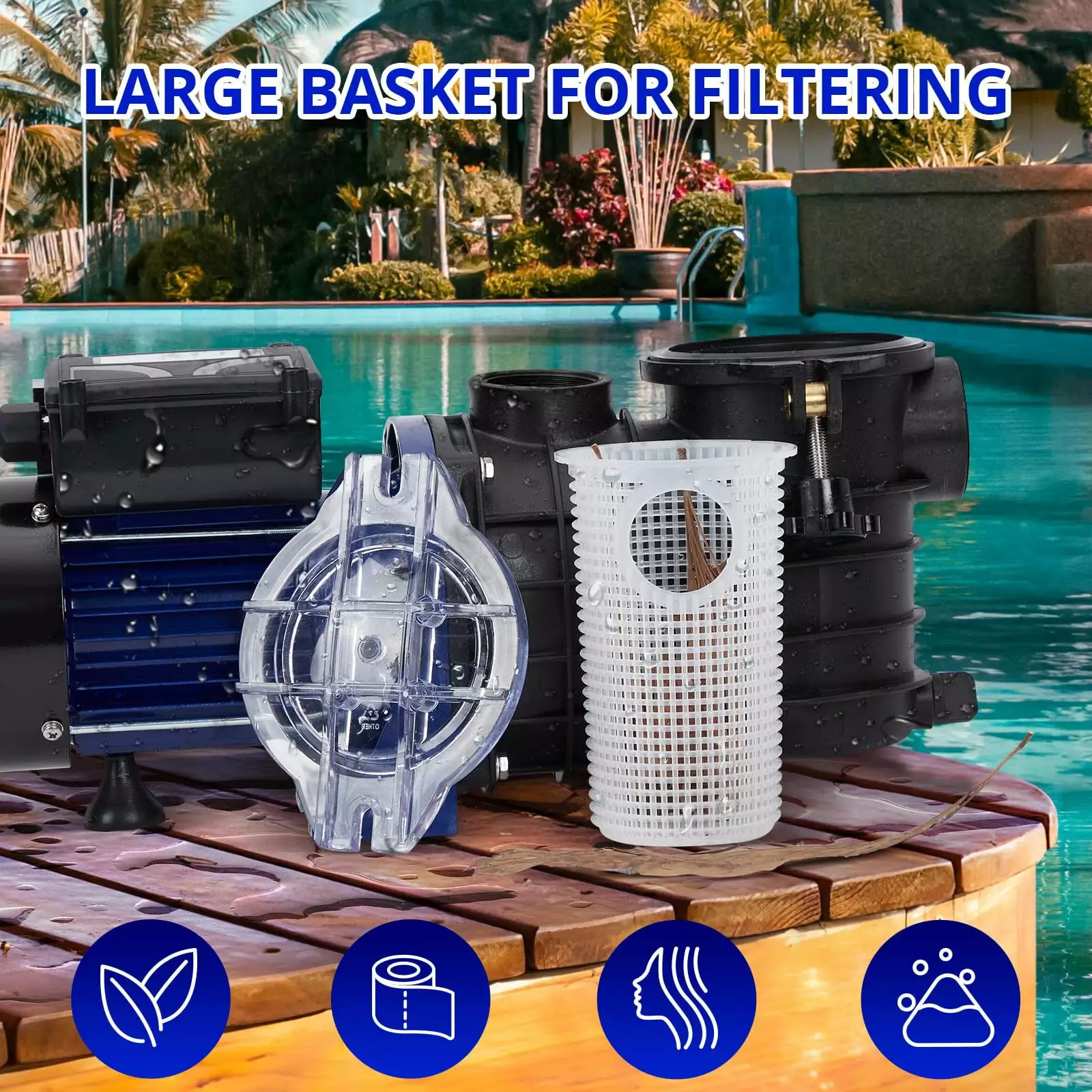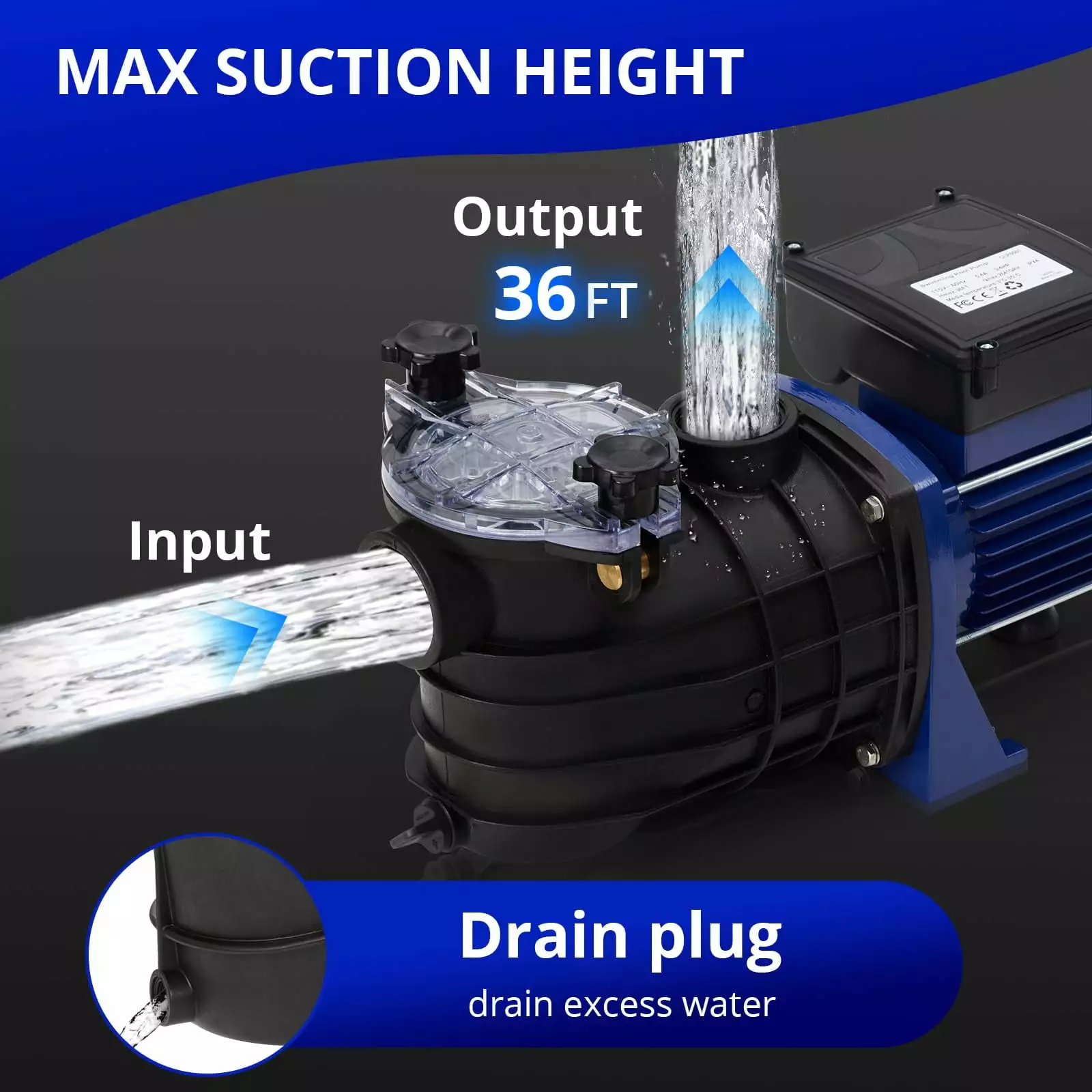 - ??Humanized Design??This swimming pool pump equipped with a drain plug on the bottom which is easy for drainage and avoids water accumulation during winter. provides easy maintenance of pump. Extra-large filter basket with clear cover keeps pool maintenance to a minimum.Transparent cover helps to judge if the basket needs clean or not.