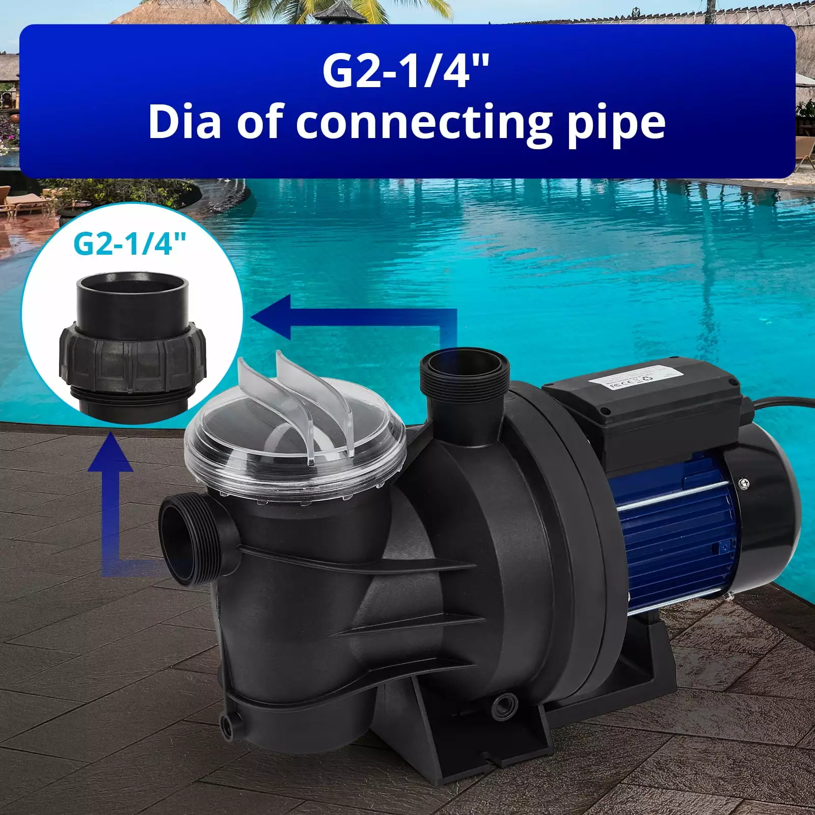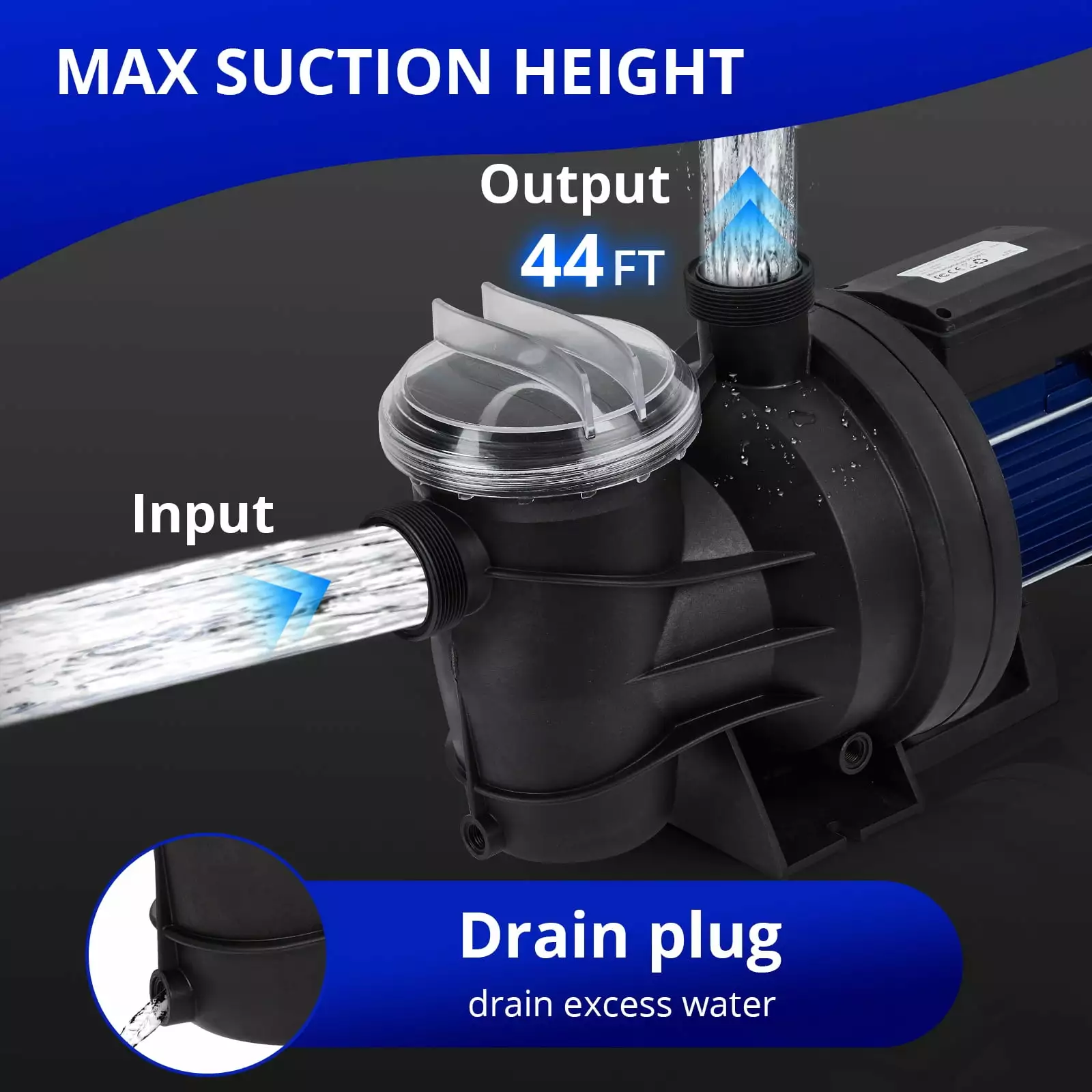 - ??Comfortable experience??Swimming pool pump equipped with a drain plug on the bottom which is easy for drainage and avoids water accumulation during winter. provides easy maintenance of pump. Extra-large filter basket with clear cover keeps pool maintenance to a minimum.Transparent cover helps to judge if the basket needs clean or not.
