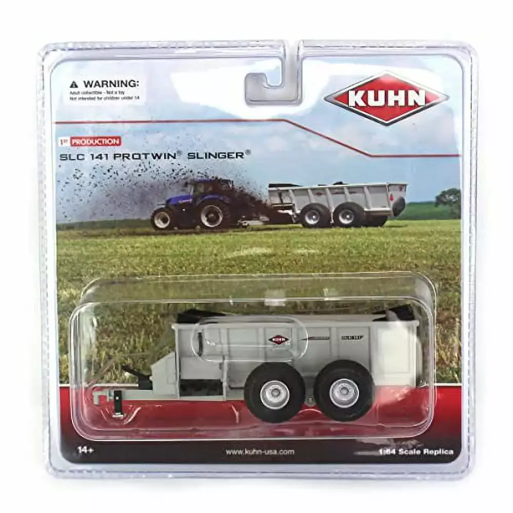 This 1/64 Kuhn SLC 141 ProTwin Slinger Manure Spreader with Tandem Axle features high detail and is very fragile. This scale model features solid diecast metal body. rolling wheels with tires. detailed spreader components such as PTO shaft. jackstand. logo’s. wheels. rotating side slinger. and is a great addition to any farm display! Per the manufacture the Kuhn manure spreader is recommended for ages 14 years and up and is not recommended for play. Tractor not included. Measures approximately 5.25in L x 2in W x 1.75in H