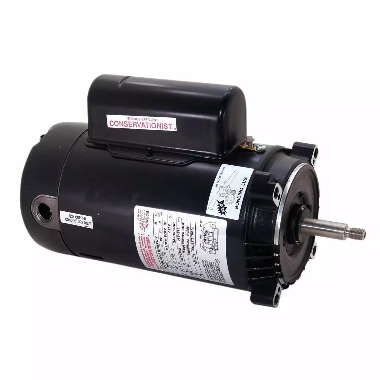 Swimming pool pump motor. Commonly found on inground pool pumps such as Hayward Super Pump. Maxflo. Super II and many other pumps requiring a 56J frame motor. This is a High Service factor motor. Amps are stated based on the full service factor. Century motors are found on most swimming pool pumps. Standard 1081 pump duty motor. Centurion switchless design. Stainless steel shaft. Sealed ball bearings. Motor has 4 threaded bolt holes on face for mounting the pump to the motor. Bolt holes are 5 7/8 on center. measured across the shaft. Wiring diagram on motor name plate. 1 year manufacture warranty. US Electric Equivalent EB654