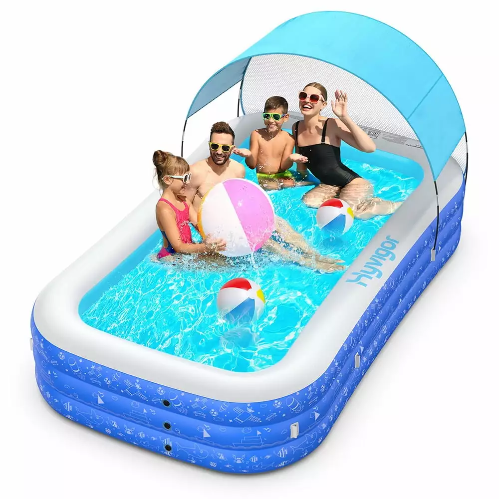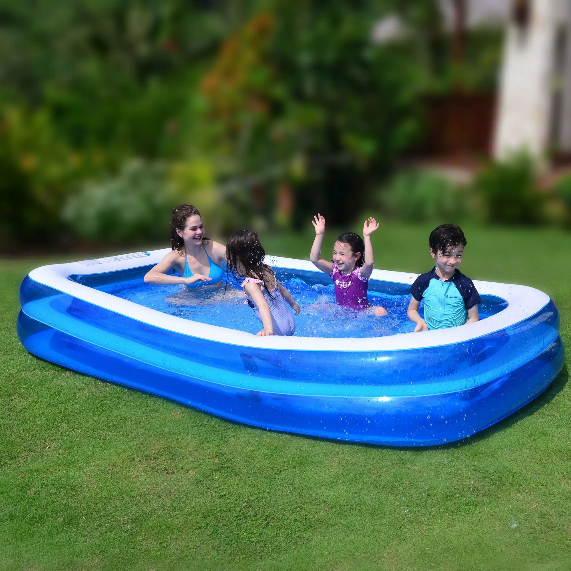 - Blue and white inflatable rectangular swimming pool