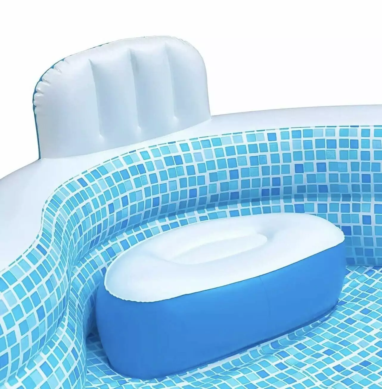 2 air-cushioned backrests and comfortable seats for extra comfort 2-in-1 valve for easy inflation/deflation Made with durable & puncture-resistant materials Includes drain plug for easy drainage of water Deflated Size:117 x 107 Inflated size:120 x 110 x 18 (26H with backrest) Includes repair patch