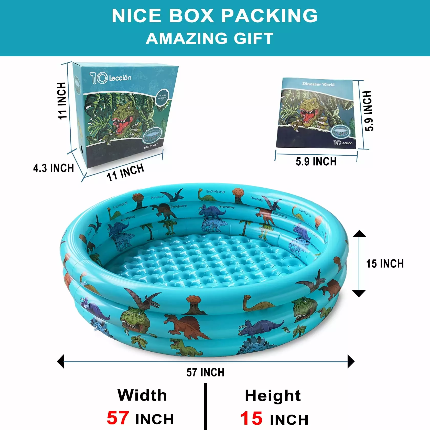 10Leccion dinosaur play central pool (piscinas parani?os) is portable. easy to blow up and move around. The blow-up padded bottom is comfortable. Your little one is comfortable while they play and paddle in the pool. The drain plug on the bottom is convenient. It is a good choice for kids to play. recreation. bathing purposes. It’s the perfect addition to any backyard. ??Padded Bottom??: The round Dino inflatable pool has a Soft Bubble Bottom. soft and full security. your little one is comfortable while they play and paddle in the pool. ??Drain Easily and Foldable??: The toddler pool have a drain hole on the bottom to easily drain water out. Quick folding. ??Non-toxic and Excellent Durable Material??: This inflatable baby pool uses safe material which is BPA-free and Non-toxic. The blow up backyard small pool is made using heavy-duty vinyl. Our toddler pool is 40% thicker than common products in the market and can better resist punctures. Repair patch included which can take care of your pool and will last a long time. ??Small Dinosaur Pool for Kids??: This Dino infant pool comes with a beautiful dinosaur design printed on PVC. It has 3 individual air chambers. inflated size: 5748 inch * 15 inches. Big Enough for 3 or 4 Children. suitable pool for kids 3-10. will give your child much-needed relief from the summer heat. ??Multi-Functions??: The Dinosaur inflatable pool can use as a baby ball pool. toys pool. dog pool. Pet House. kids fishing pond. baby bathtub. child sandpit. Dino party decoration. and a great toddler swimming pool for kiddy babies toddlers beach outdoor indoor garden backyard. Also. It will be a great birthday gift for your son daughter grandkids.