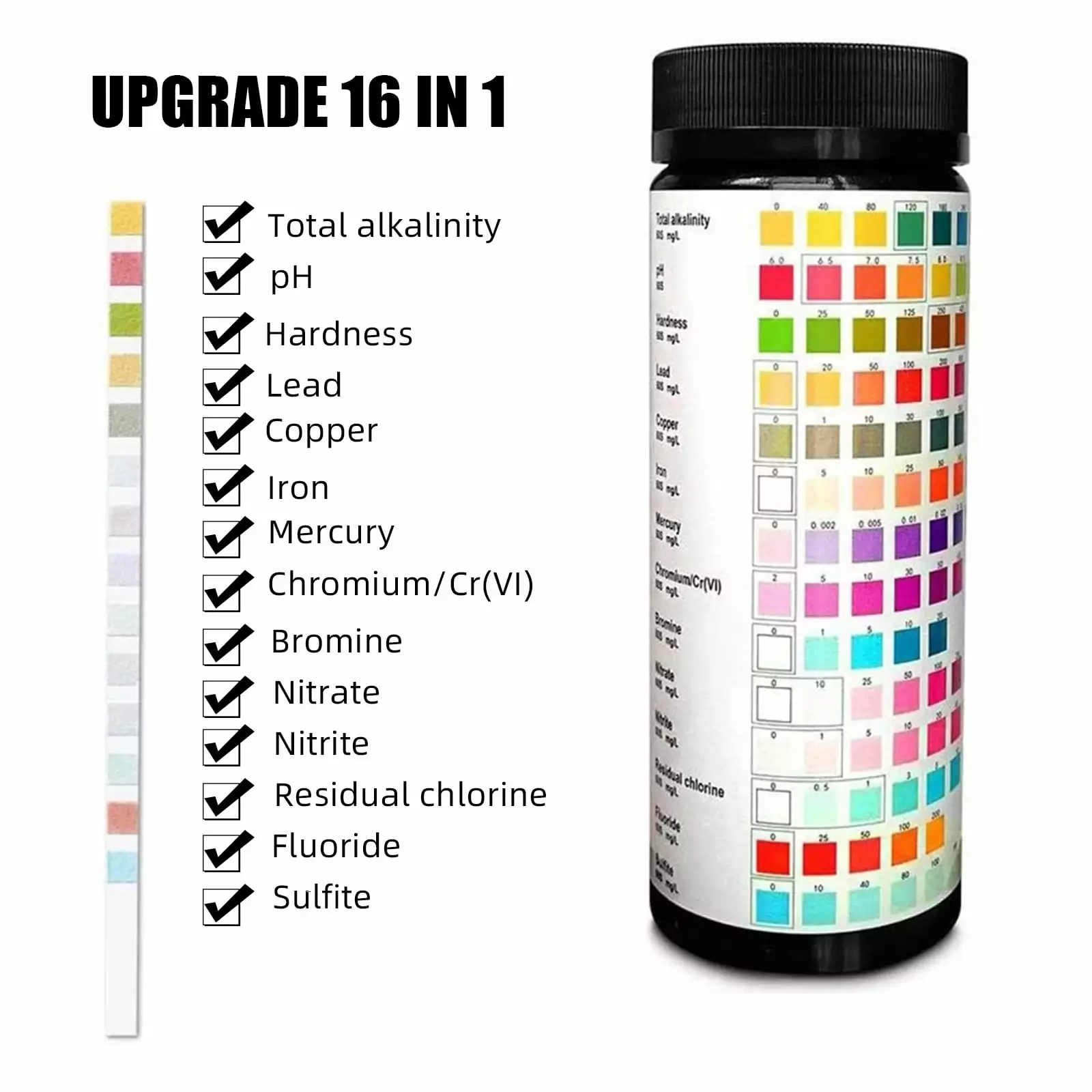 16 in 1 Drinking Water Test Kit Strips. Water Quality Test for Tap Water. Pool. Spa. Strips for Water Hardness. Chlorine. Mercury. Lead. Aluminum. Fluoride. Iron. pH and More(100PCS)