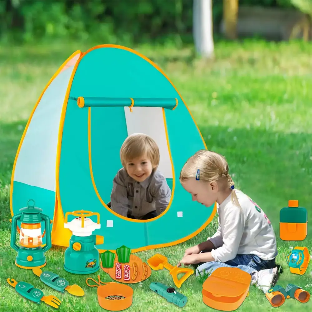 19 Pieces Kids Camping Kit: Kids camping set includes all the necessaries for little explorers enjoy their camping adventure. Including a pop up play tent. gas stove. oil lamp. pan with folding handle. first aid kit. shovel. watch. 2 plates. army pot. 2 sausage. 2 roast meat. 2 green pepper. telescope and whistle. utilty knife.