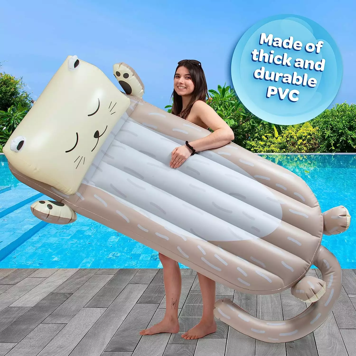 Get ready for fun in the sun with our cute otter-themed pool float! With its adorable design and extra-large size measuring over 5 1/2 feet long. this float is perfect for stretching out and soaking up the sun or splashing around with friends. Featuring a built-in elevated headrest. this float offers added comfort for ultimate relaxation. Made from high-quality. heavy-duty PVC. this inflatable pool float is durable and built to last. making it perfect for pool parties. the beach. river. or lake.