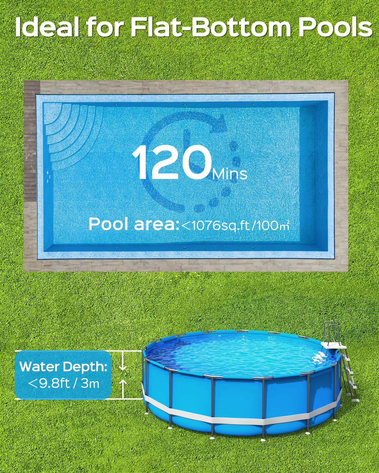 - 120-Min Runtime: 8800mAh battery offers up to 110 minutes of strong suction and efficient cleaning. Extended 120 Min operation time for comprehensive pool cleaning. ensuring thorough coverage for pools up to 60 feet or 1300 sq. ft