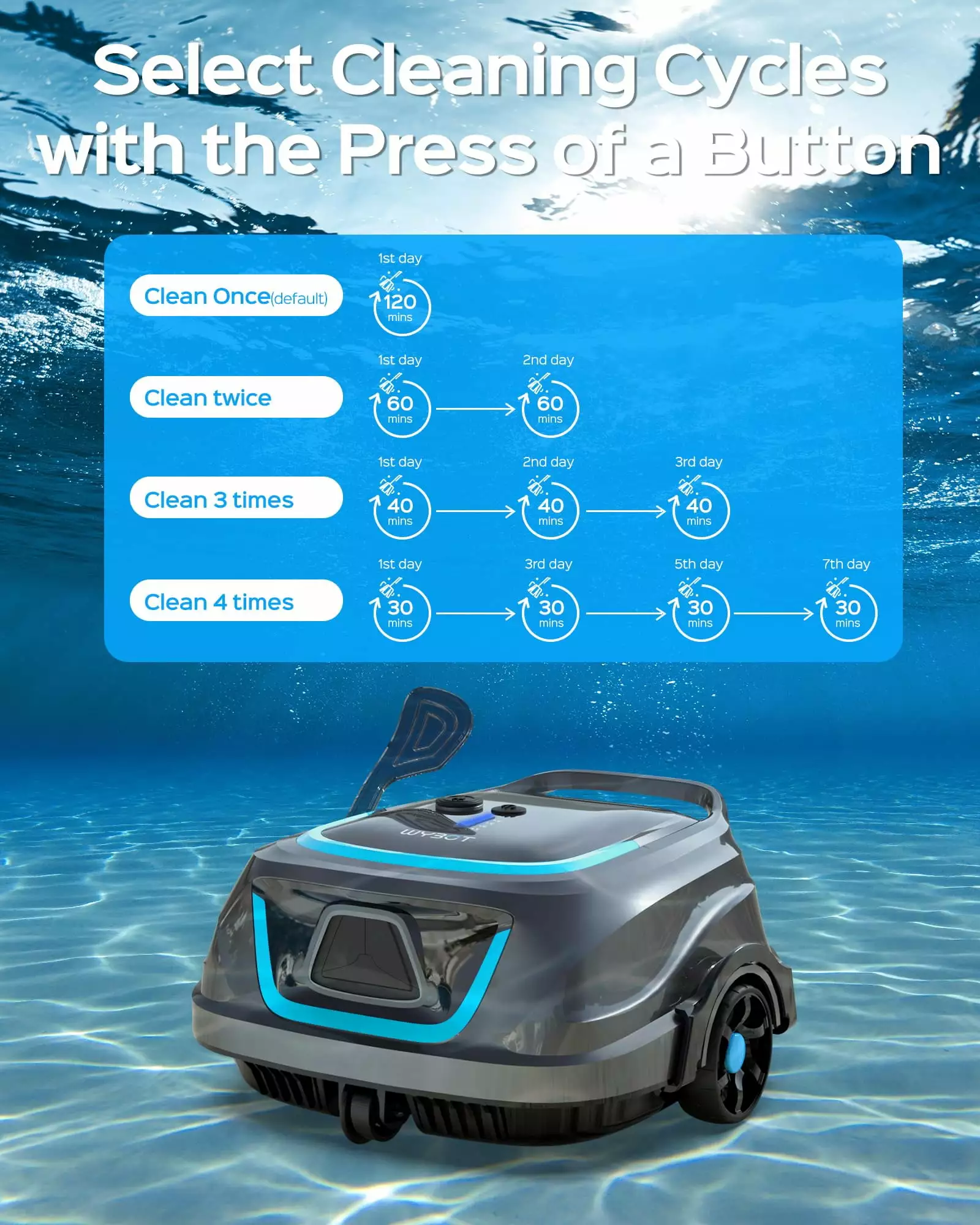 - Cleaning Cycles: WYBOT A1 Cordless Pool Vacuum intuitive app control for custom cleaning schedules and self-parking technology. offers four selectable cleaning cycles. accommodating a week’s cleaning needs with powerful suction
