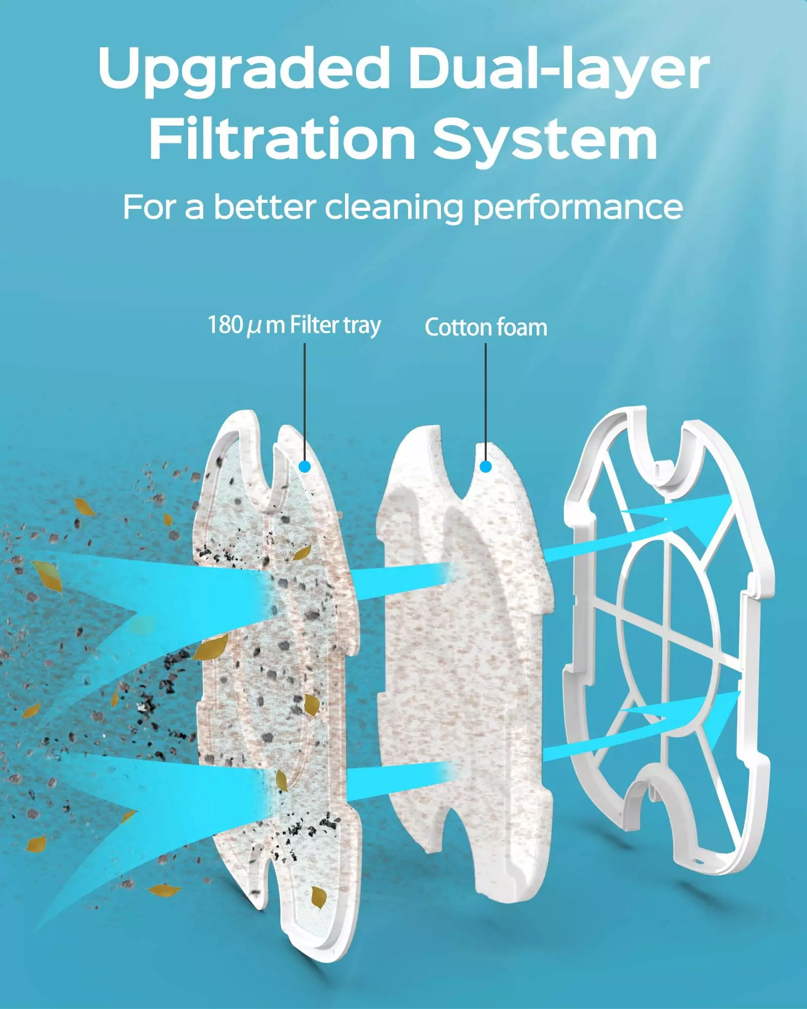 - Dual-Layer Filtration: Features a unique 180??m + cotton foam system. increasing the filtration area. with a doubled suction port size for larger debris by 70% for superior cleanliness.Captures everything from fine particles to large debris.