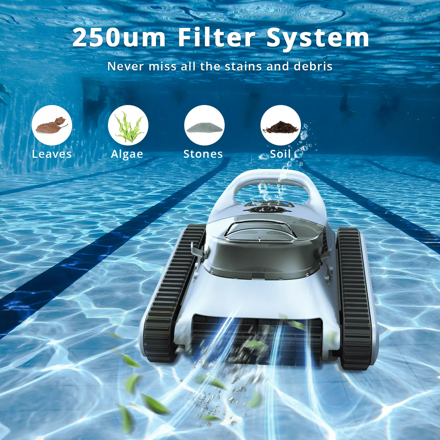 | Features | Cordless. EnergyEfficient. UVResistant. Built-inCartridge. CorrosionResistant. CrackResistant. IndicatorLight. ProgrammedSteering. RemoteControlled. ScrubsTile. WideCleaningPath. EasytoAccessDebrisChamber. EasytoCleanFilterCartridge. ExtraLargeFilterBagCapacity. FlexibleHose. RechargeableMotor. TopAccessforFilter. Wi-FiCompatible |