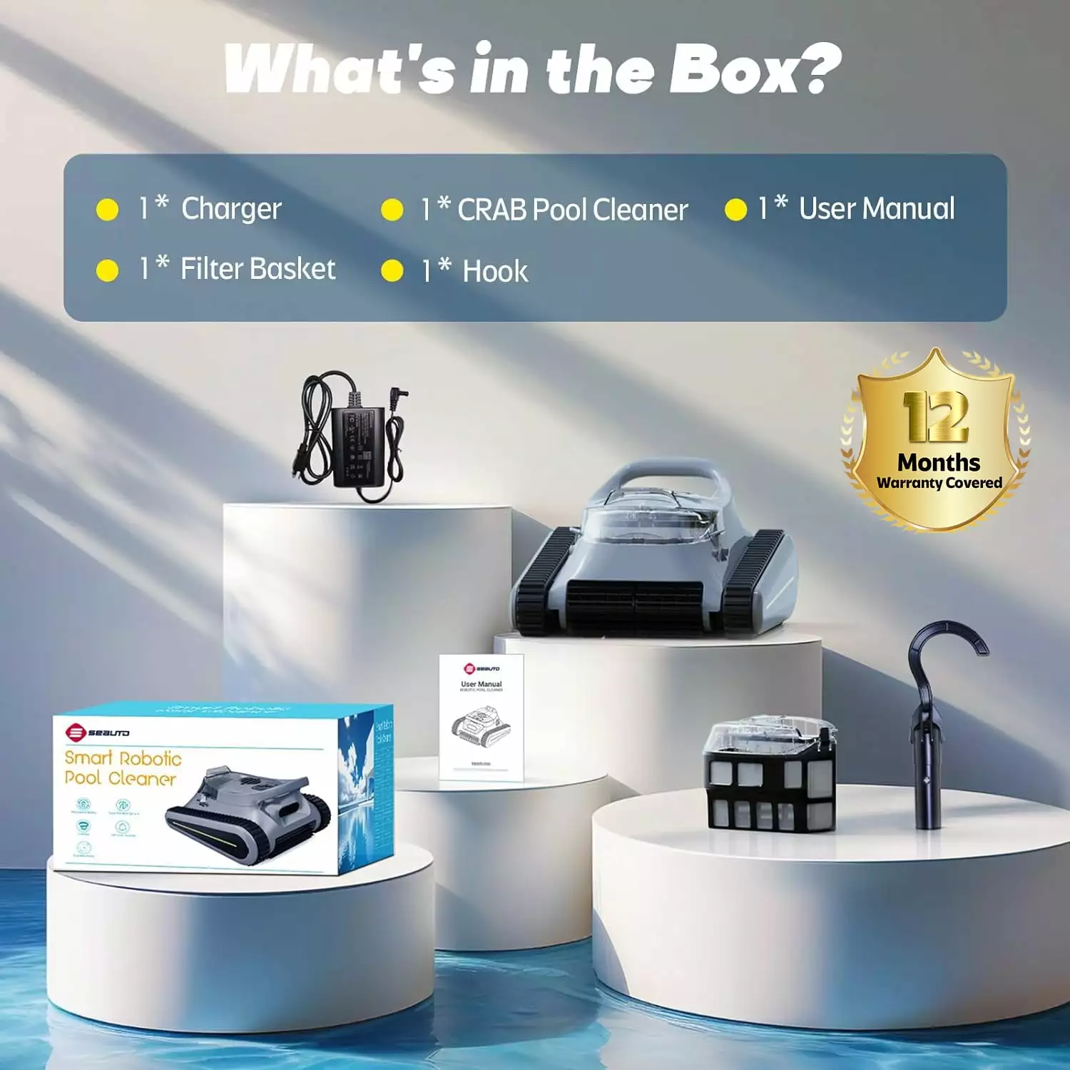 Seauto 2024 New Robotic Pool Cleaner Crab is Gray colorFeatures :?This smart pool cleaner can One-Click Start for No complicated setup.Start it and throw it into the water to start working?This pool cleaning equipment is fitted with front-and-back scrubbers. plus a 108W brushless motor that dishes out 4500pa of suction power.?Powered by a robust 7800mAh battery. this robotic pool cleaner can work non-stop for up to 2.5 hours on a single charge.?The pool cleaner robot may be used for above-ground or in-ground pools up to 1614 sq. ft.and uses sonar route planning to navigate your pool.Multipack Quantity:51 ? Seauto Crab Pool Cleaner.1 ? Charger Adapter.1 ? Retrieval Hook.1 ? Filter Basket.1 ? User ManualMade of synthetic material and the top has a curved design that is made to reduces the resistance of the machine