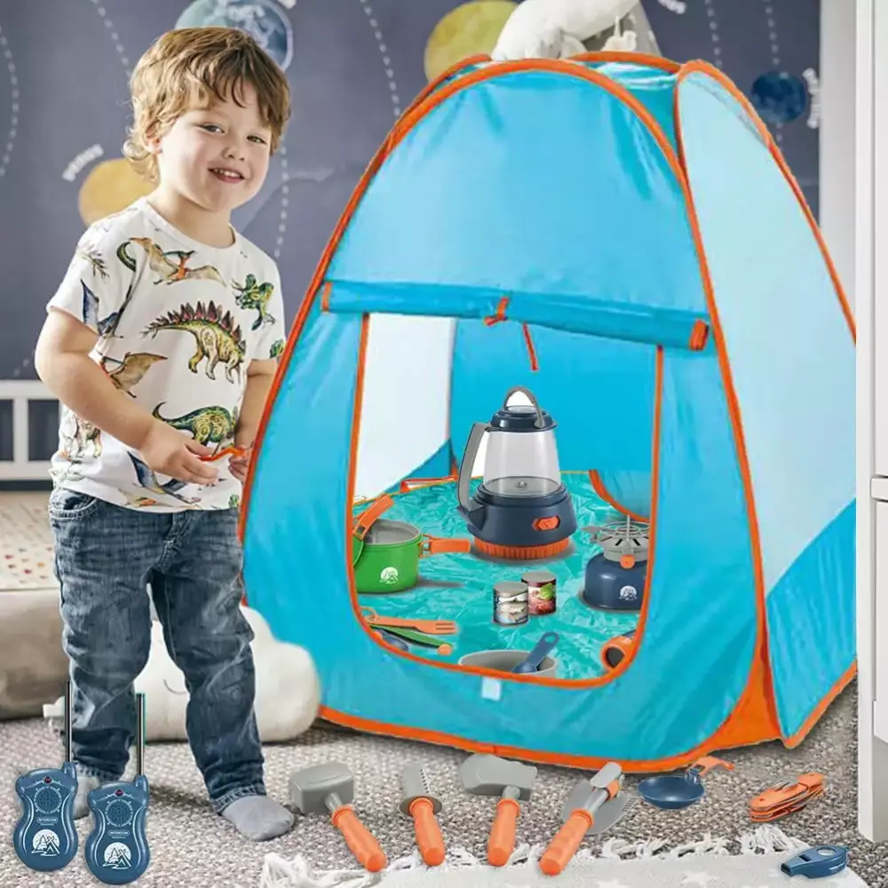 29Pcs Kids Camping Set Play Tent with Receiver Campfire Picnic Tableware Cooking Set Indoor Outdoor Pretend Play Set for Boys Girls