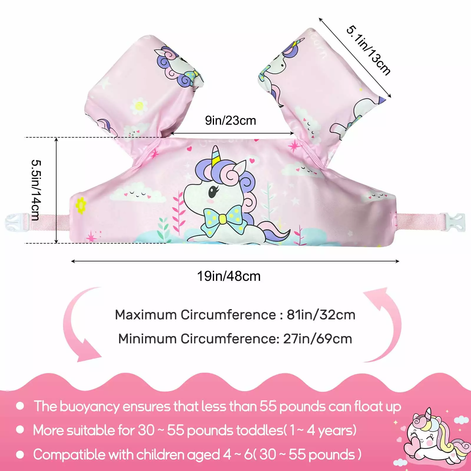 - ?SAFE ?? SECURE??— The swim vest with arm wings is secured with a safety buckle at the kid’s back. so that the kid can’t open it alone; adjustable strap to fit all sizes between 30-55lbs(4-6 years). And also used as toddler swim vest for toddler weighing from 30-55 lbs.