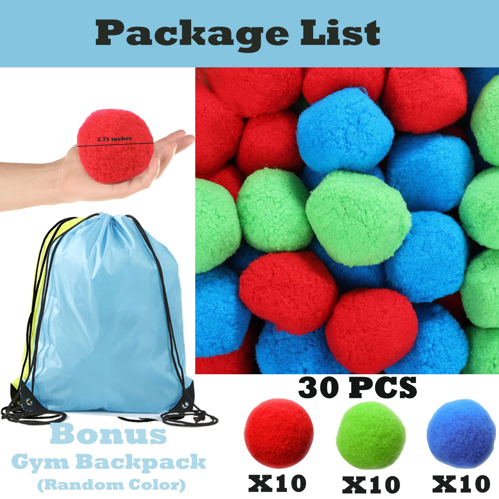 You will get: 30 pieces realistic water balls(about the size of a tennis ball) in 3 bright colors;Bonus Gym Backpack for storage and carrying