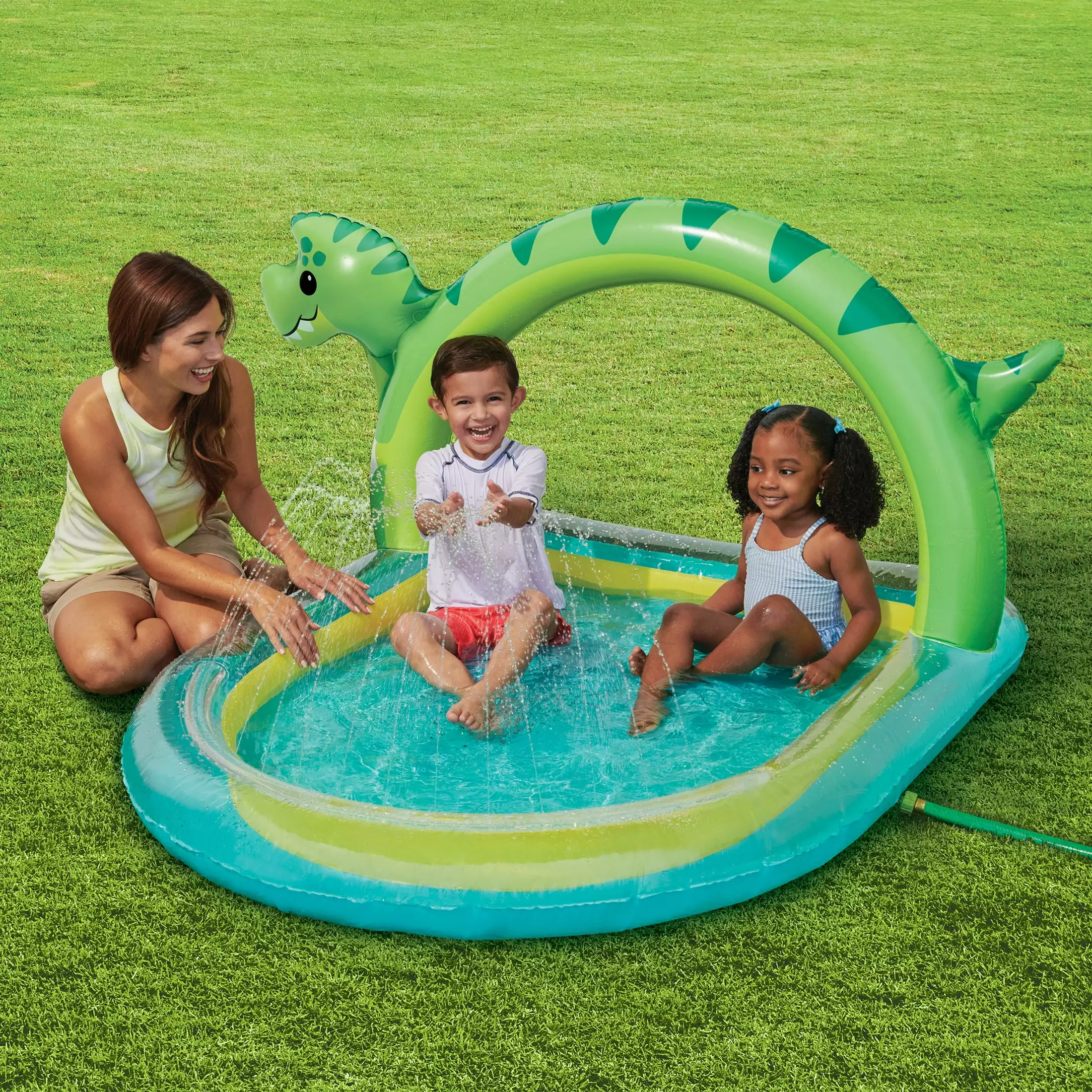 The Dino Arch Sprinkler will add endless fun to your summer. Durably constructed. this giant dinosaur arch has a built-in water sprayer that is operated by connecting it to any standard hose. making it extremely convenient. The sprinkler is attached to a splashing pool. giving your kids a place to have a refreshing time under the sun. Cool off under the prehistoric arch of this Dino Arch Sprinkler all season long.