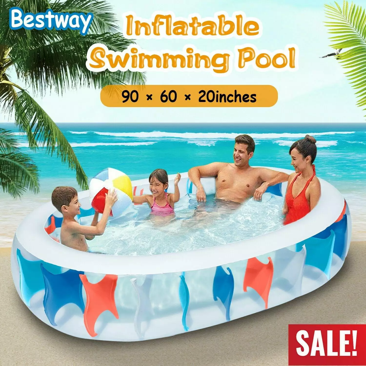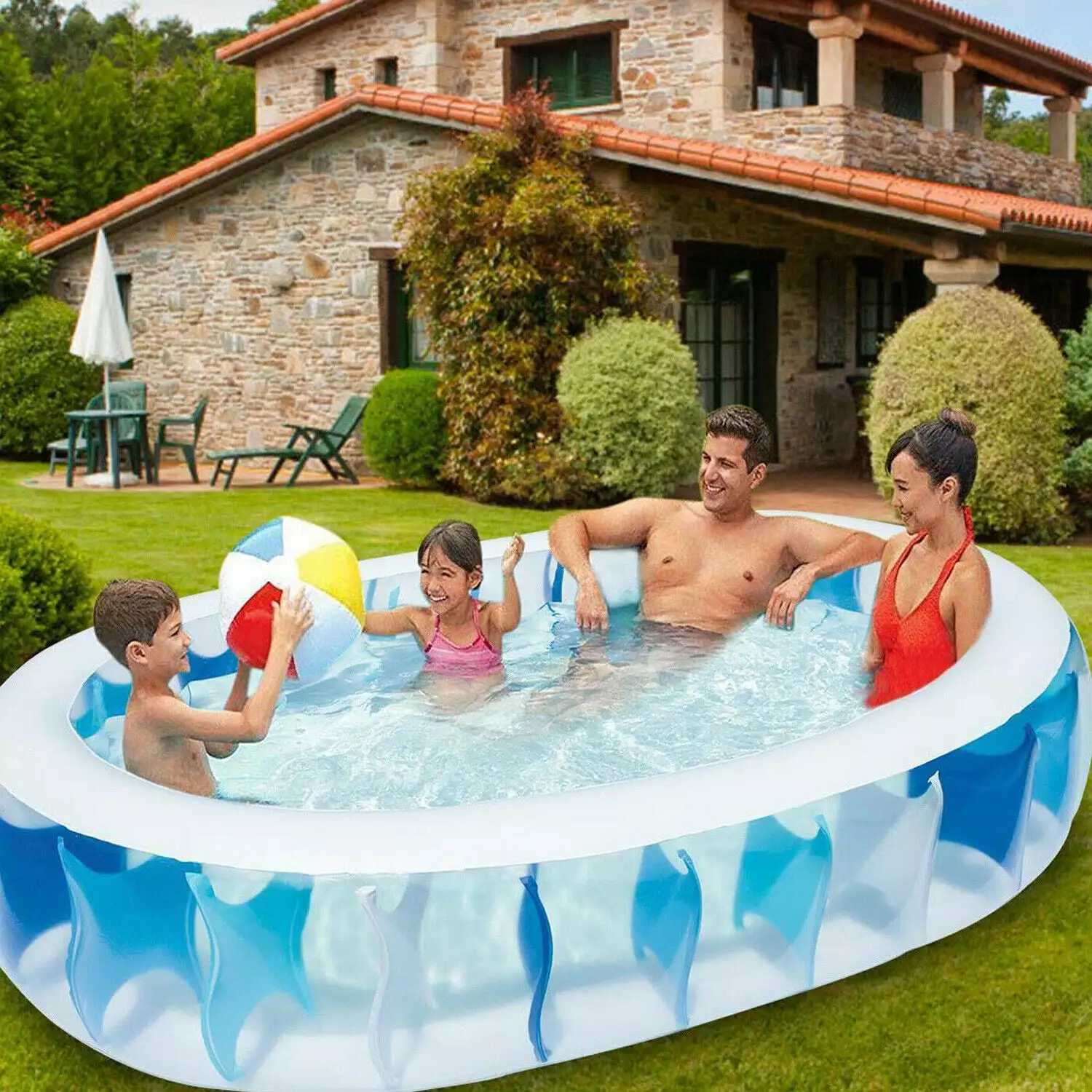 - HAPPY KIDS TOGETHER:90??60??20inches Inflatable size is recommended family(4 People) splashing pool party in the backyard. Anti-skid surrounding walls of swimming pool.place your head on it and enjoy the sunshine and water party.