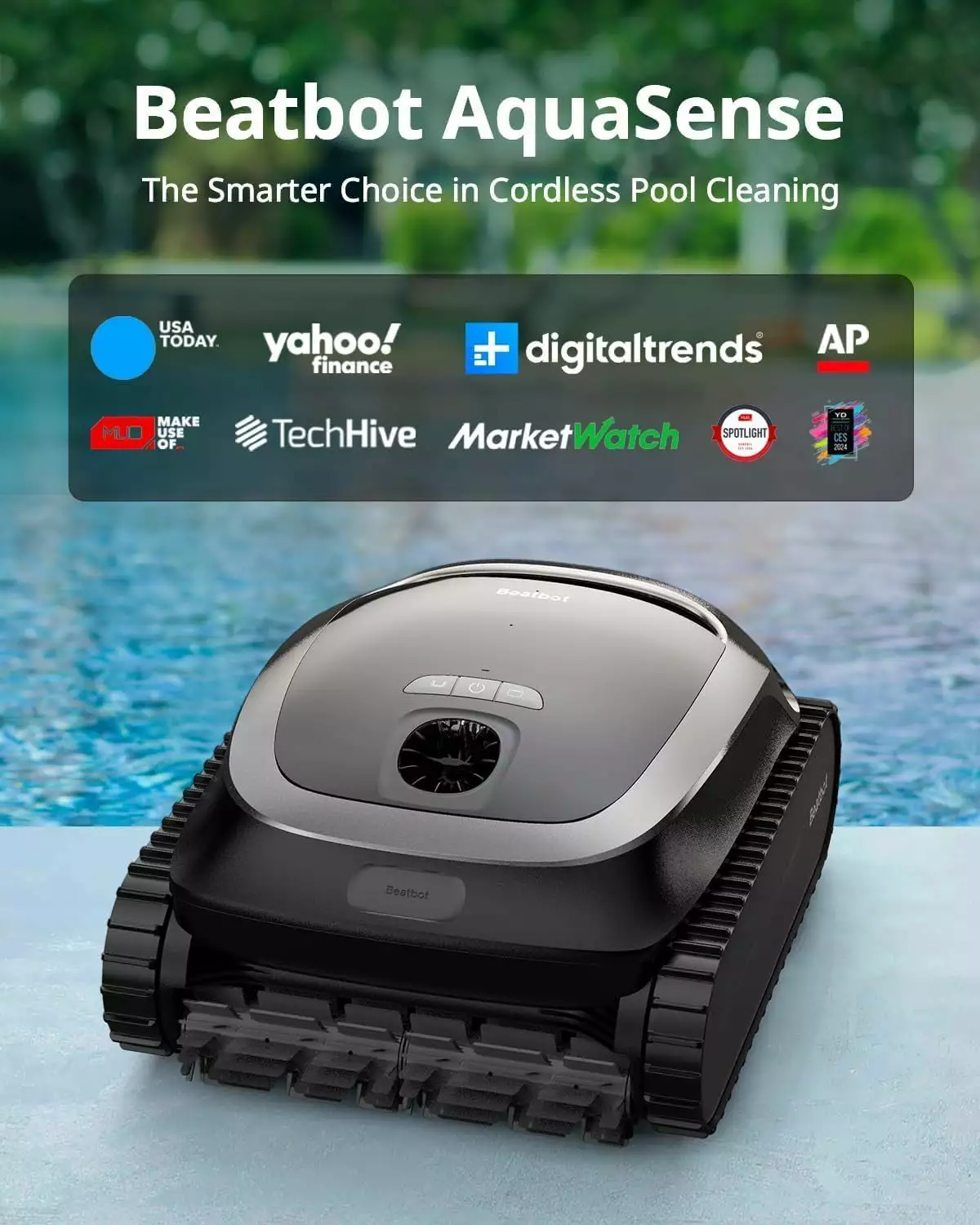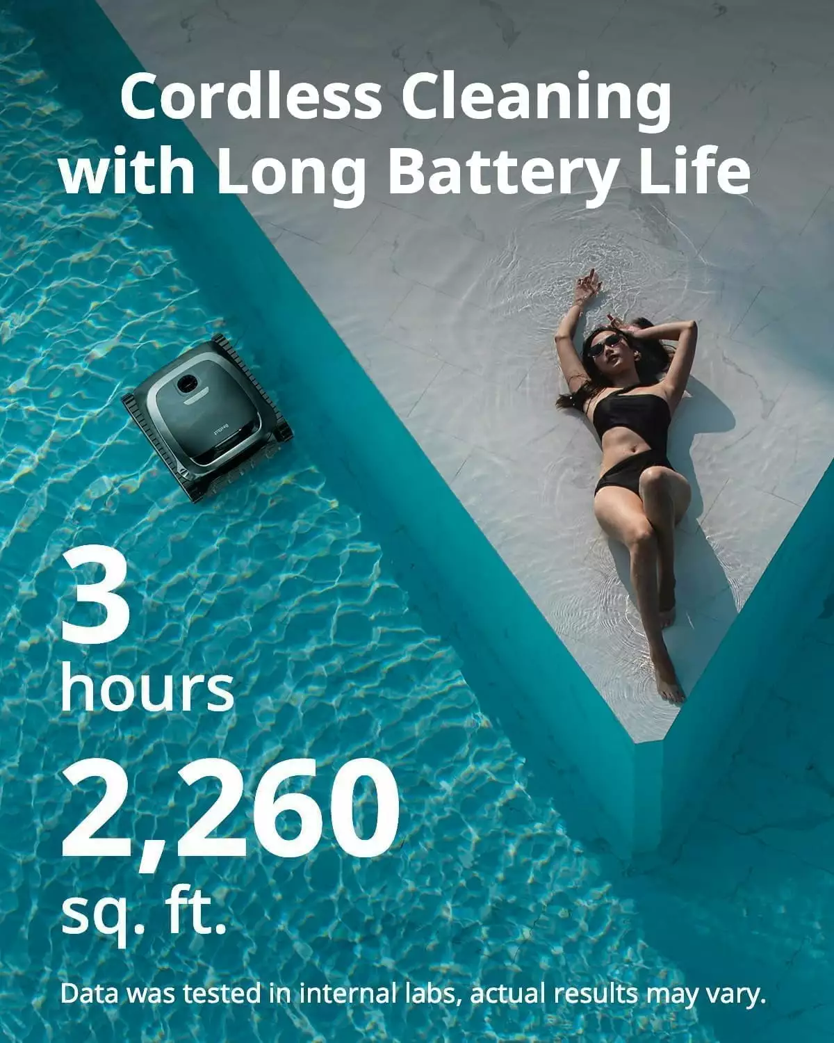 Completely Cordless: cleans floor. walls. and waterline with a cordless design. AquaSesne offers 3 hours of floor cleaning on a single charge based on Beatbot laboratory data. Additionally. this pool cleaner robot comes with a cordless charging dock for plug-free charging.