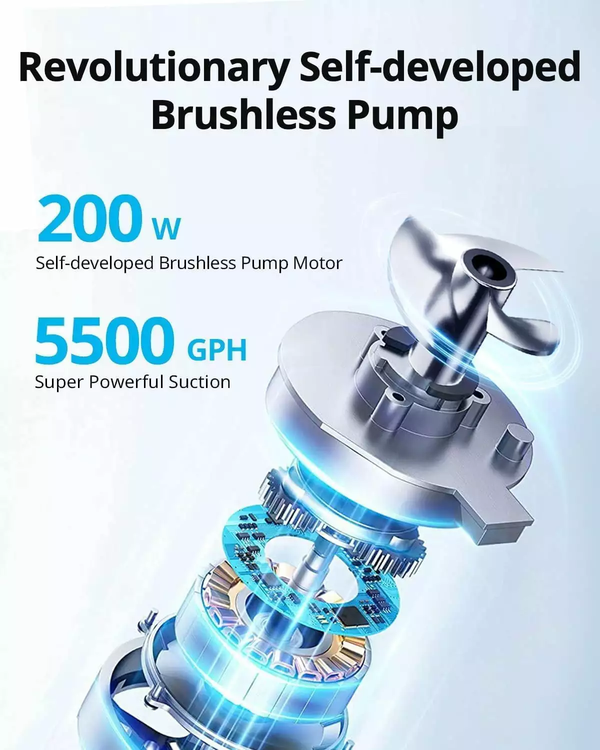 Powerful Cleaning & Wall Climbing: The robust 200W brushless main-pump motor generates massive suction powerful and ultra-strong 5500GPH. effectively climbing walls including arc-shaped walls. and capturing debris in the ultra-fine 150??m filter basket.