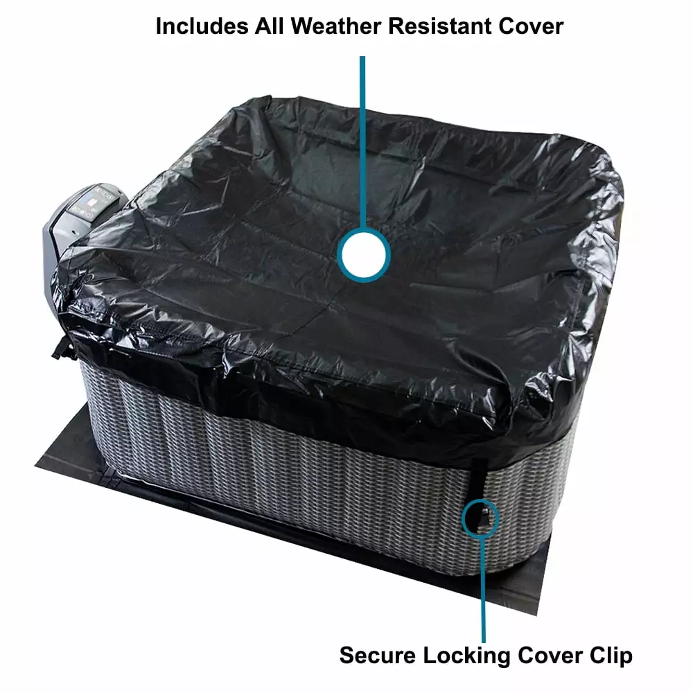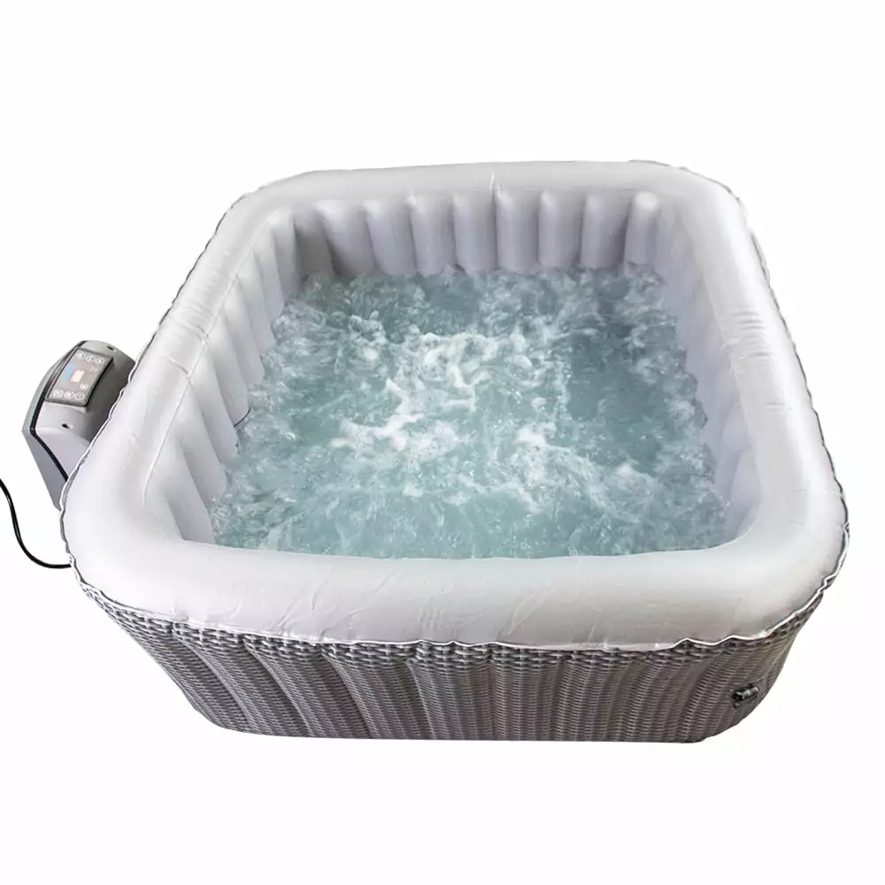 Relax after a long day in the inflatable square spa that can fit in your own backyard. With a 4-person capacity this spaciously designed spa quickly heats its water to a comfortable 104 degrees Fahrenheit. The spa easily plugs in with a 110-120V power supply so you can enjoy the relaxing atmosphere and feel rejuvenated in the comfort of your own home. The LED display makes it simple to control the temperature and other features of your spa to get a personal experience. When not in use place the included cover over your spa. or easily deflate the spa and store it. Enjoy warm temperatures all year round with superior comfort and support. Take your spa on the go with you to family camping trips or even the next tailgate! This portable spa can pop up at any event in less than 10 minutes and should be used in temperatures about 39 degrees Fahrenheit. Please place spa on a flat and even area that is clear of any debris. the surface must be able to hold the weight of the spa completely filled (1.200 pounds) and occupants.