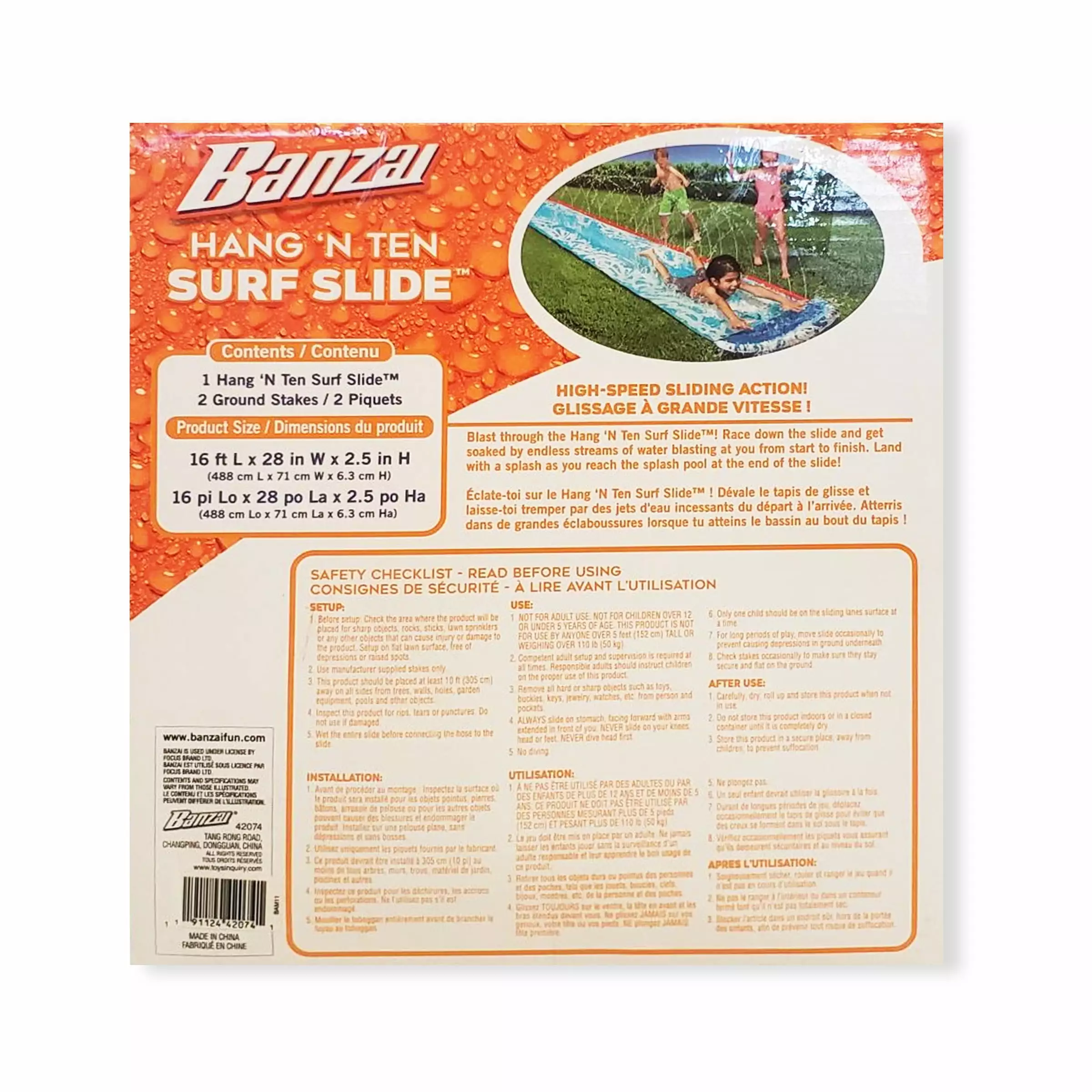 - What can be better than summer time outside. Spend it with fun with your friens and wash off the summer heat by surfing and sliding down this 16 ft slide. Refreshing water-sprinkling rail keeps the sliding surface wet and slick.Let Hang N Surf Slide create the summer memories that will last forever. Easily attaches to any garden hose Repair patch included Recommended for ages 5-12 Durable PVC construction 16’L x 28W water slide