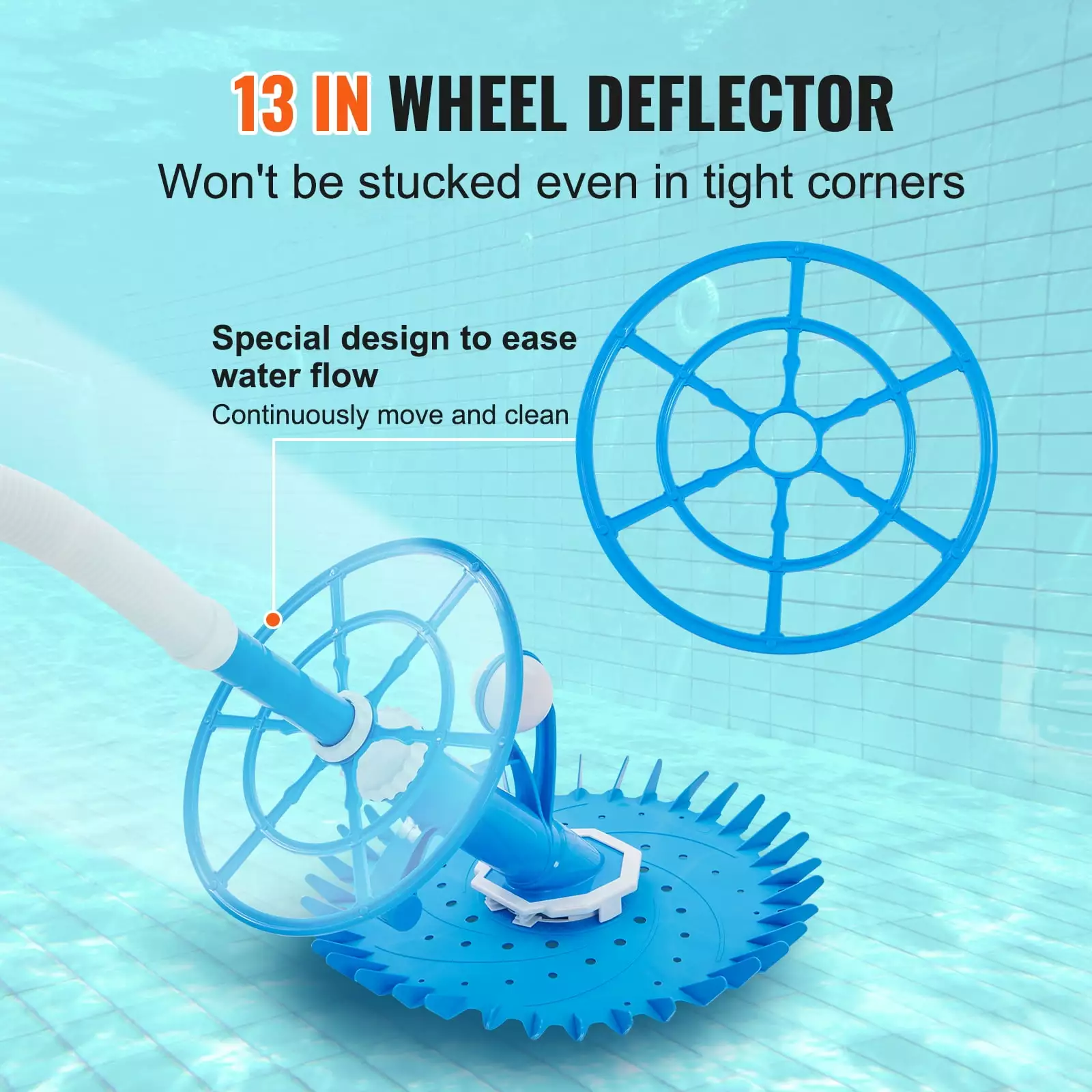 - 13 In Wheel Deflector: Equipped with a 13-inch wheel deflector. our automatic suction pool cleaner ensures uninterrupted movement and cleaning. It effortlessly maneuvers even in tight corners without getting stuck. Experience the joy of a thorough and impeccable cleaning that leaves your pool sparkling.
