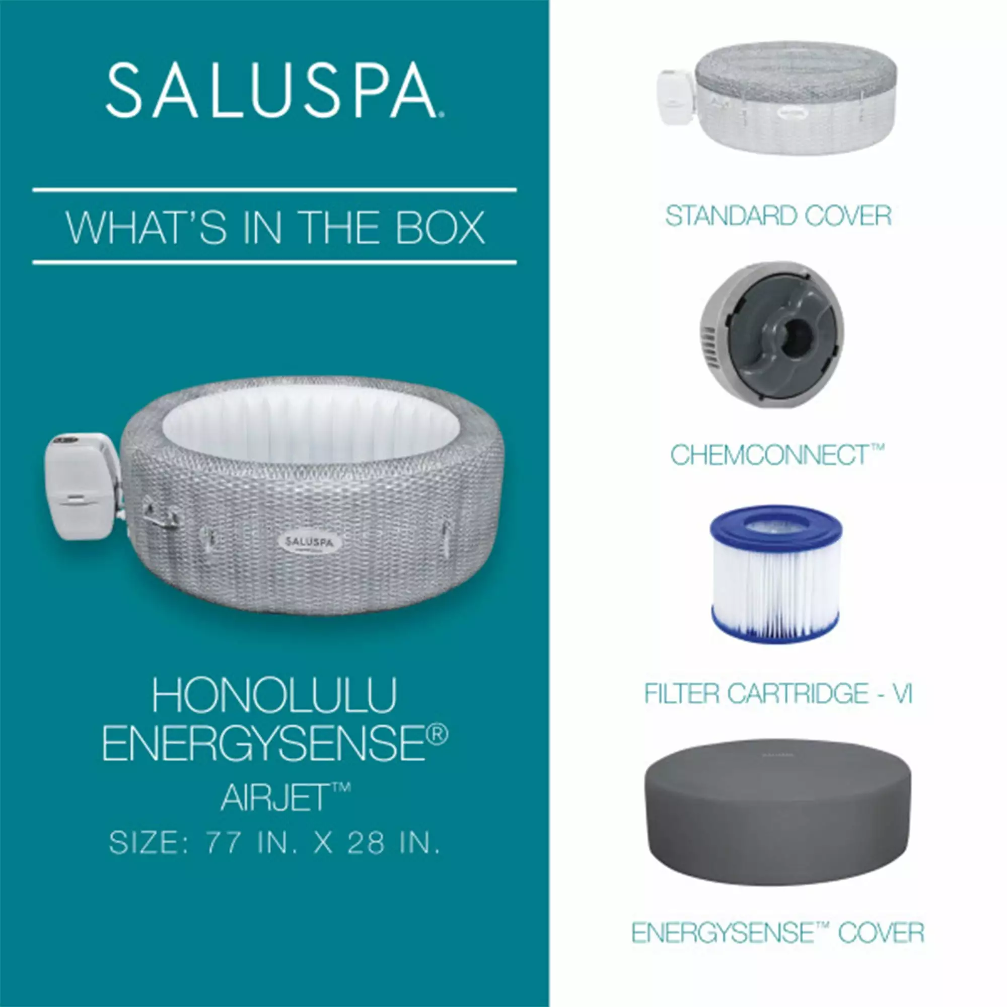 Indulge in ultimate relaxation with the Bestway Coleman Honolulu AirJet Inflatable Hot Tub with 4-Pack SaluSpa Spa Seat. This spa’s spacious. round design provides a soothing massage experience for up to 6 people. Featuring an AirJet system with 140 jets. this hot tub releases bubbles from the bottom of the spa to create a warm. bubbling hot tub environment. These calming bubbles will help you relax and unwind from the comfort of your home. Whether you’re seeking a solitary escape or hosting a gathering of friends. this spa caters to your every need. Built with durable DuraPlus materials to avoid damage. you can ensure this hot tub retains its shape after repeated inflation and deflation. Including a FreezeShield with an automatic heating function. this hot tub’s inner components will not freeze during colder temperatures. The true game-changer is the included EnergySense Cover. which ensures the water remains at the ideal temperature and conserves energy. making it a great choice. Meanwhile. the SaluSpa Spa Seat offers customizable height and non-slip. weighted feet for stability. These seats ensure comfort and durability. are easy to clean. and are adaptable to any SaluSpa model. Enjoy unparalleled peace with Bestway Coleman Honolulu AirJet Inflatable Hot Tub with 4-Pack SaluSpa Spa Seat.