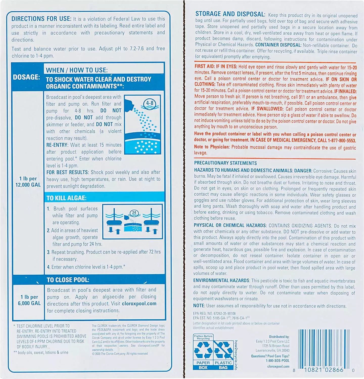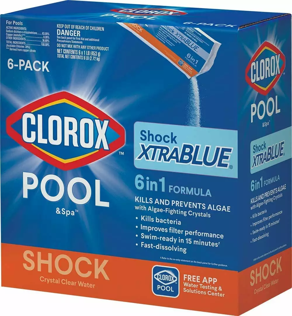 Enjoying your beautiful pool just got easier with the convenience and power of Shock XtraBlue. Other pool shocks stop at clearing a cloudy pool. but Clorox Pool&Spa Shock XtraBlue goes beyond other shocks to keep your water beautiful and swim-ready all season. The fast dissolving pool shock formula not only removes the bacteria and contaminants that can cause cloudy water. Shock XtraBlue also helps control algae growth including common green algae. slimy mustard algae. and stubborn black algae. It works this hard for you without bleaching your liner or affecting pH like other brands of pool shock. Use Shock XtraBlue as part of your weekly maintenance for sparkling. crystal clear water all season long.