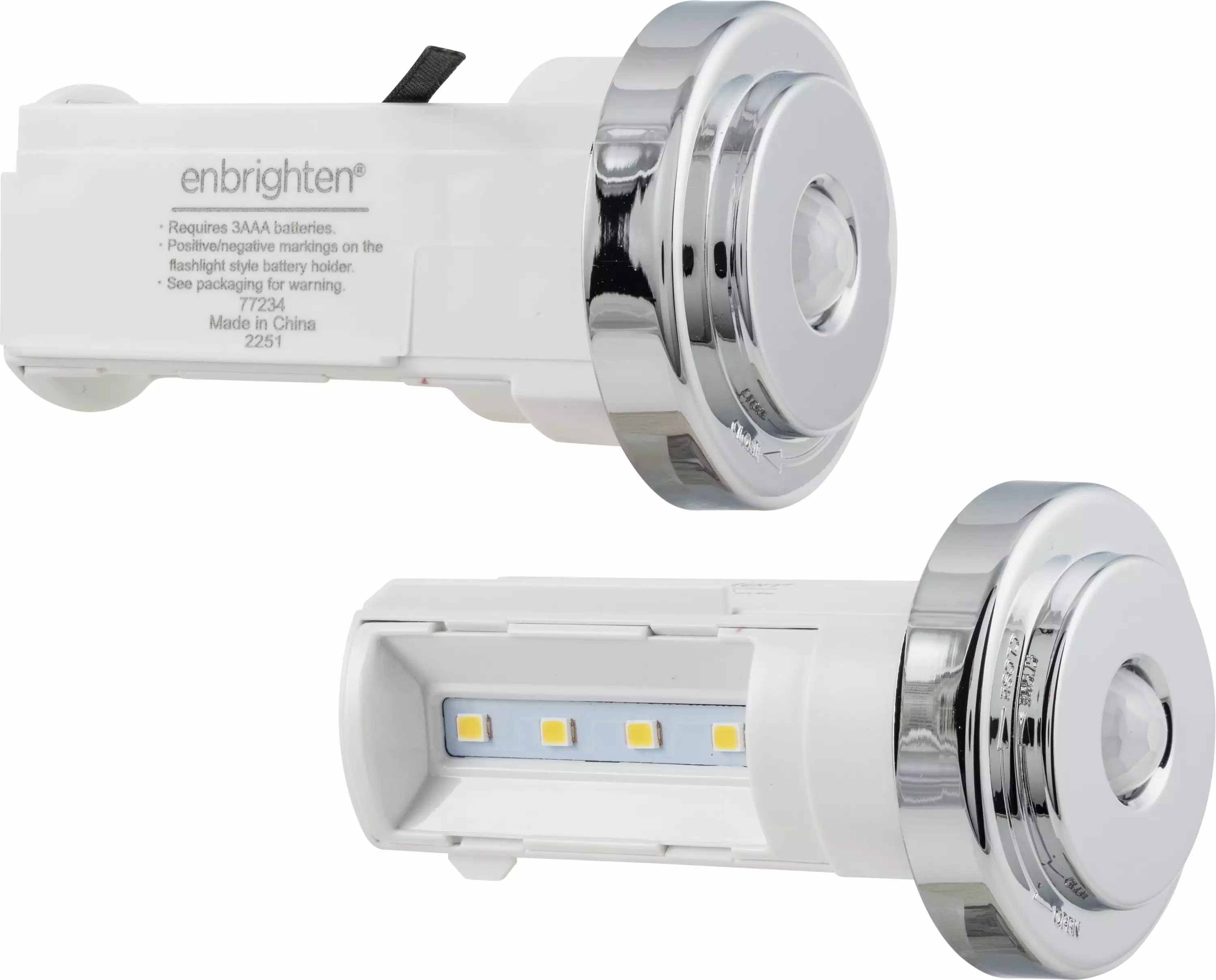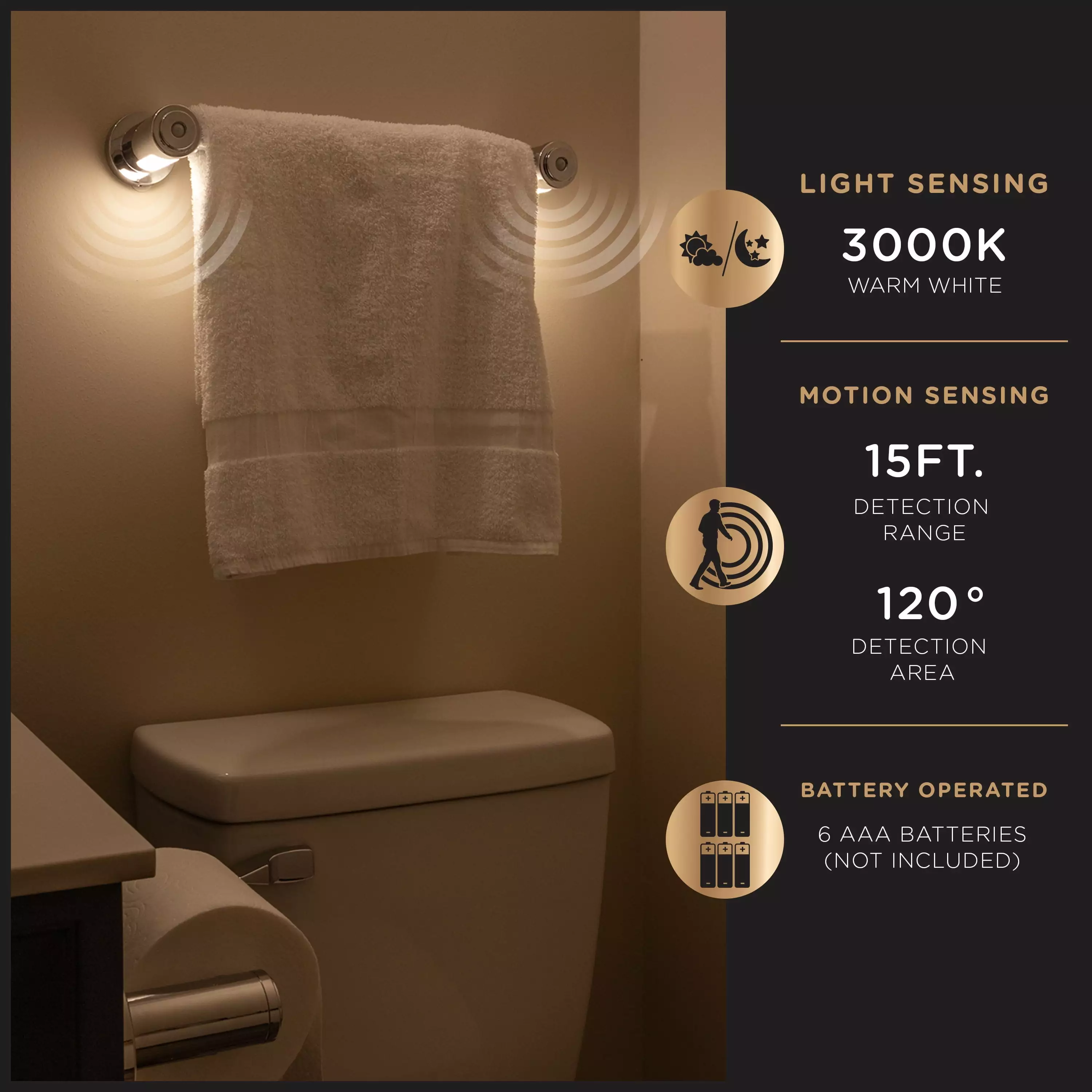 Experience a new way to light your bathroom with the Enbrighten Towel Bar Light. Each item in the Enbrighten bathroom lighting ecosystem ?? toilet paper holders (77233). bath towel bars (77234). hand towel rings (77235) ?? is designed for function and décor. This bath towel bar features motion-sensing LEDs paired with a stylish chrome finish. When motion is detected within 15ft.. the bar’s two LEDs light up with warm white light. The bar’s long-lasting LEDs are powered by 6 AAA batteries (not included). The LEDs also turn off 60 seconds after movement stops to conserve battery life. The 18in. bar is easily installed with the included double-sided tape or screws and anchors. All hardware is included. Each item in the bathroom lighting set is perfect for homes. rentals. renovations. spas. gyms. restaurants. offices and much more. For lighting that combines function. style. and quality. choose the Enbrighten Towel Bar Light.