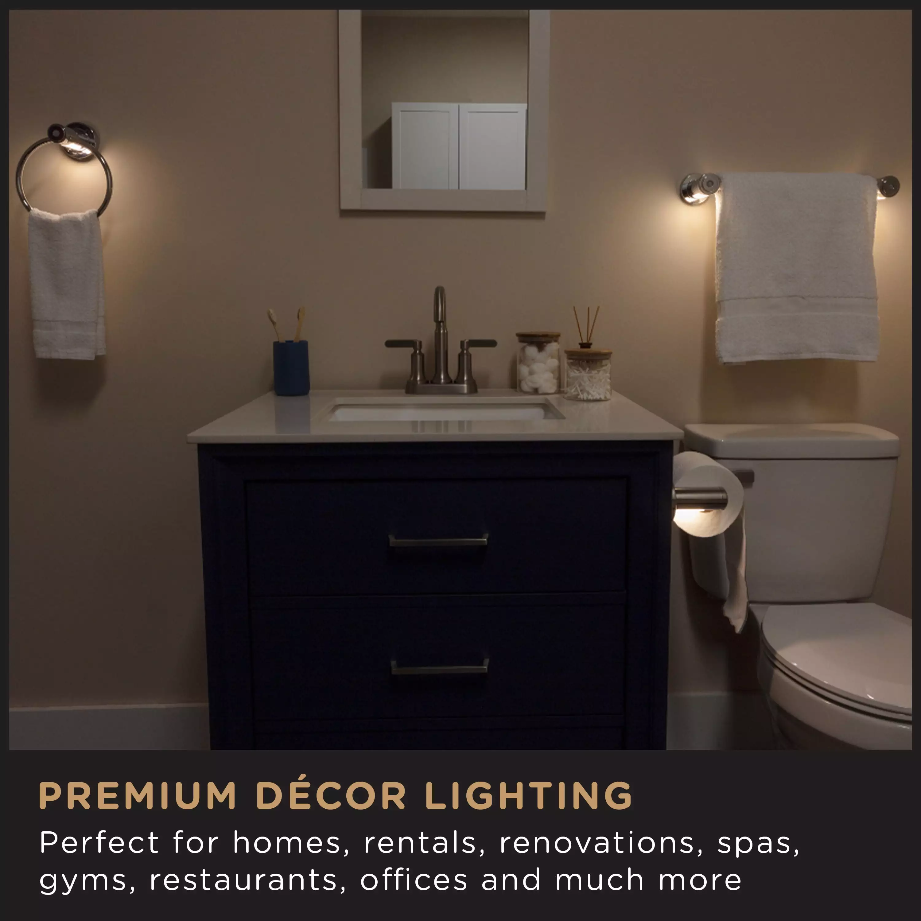 - Bath Towel Bar LED ?C Premium accent lighting for bathrooms. a stylish chrome finish. a sturdy 18in. design and an easy install ?? perfect for rentals. homes. renovations. property builds. spas. gyms. offices. restaurants. bars and more