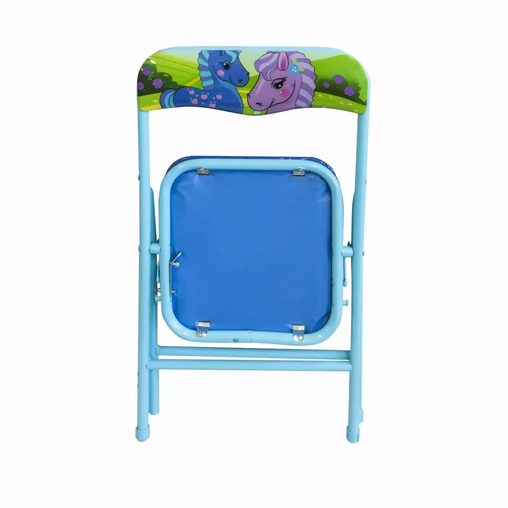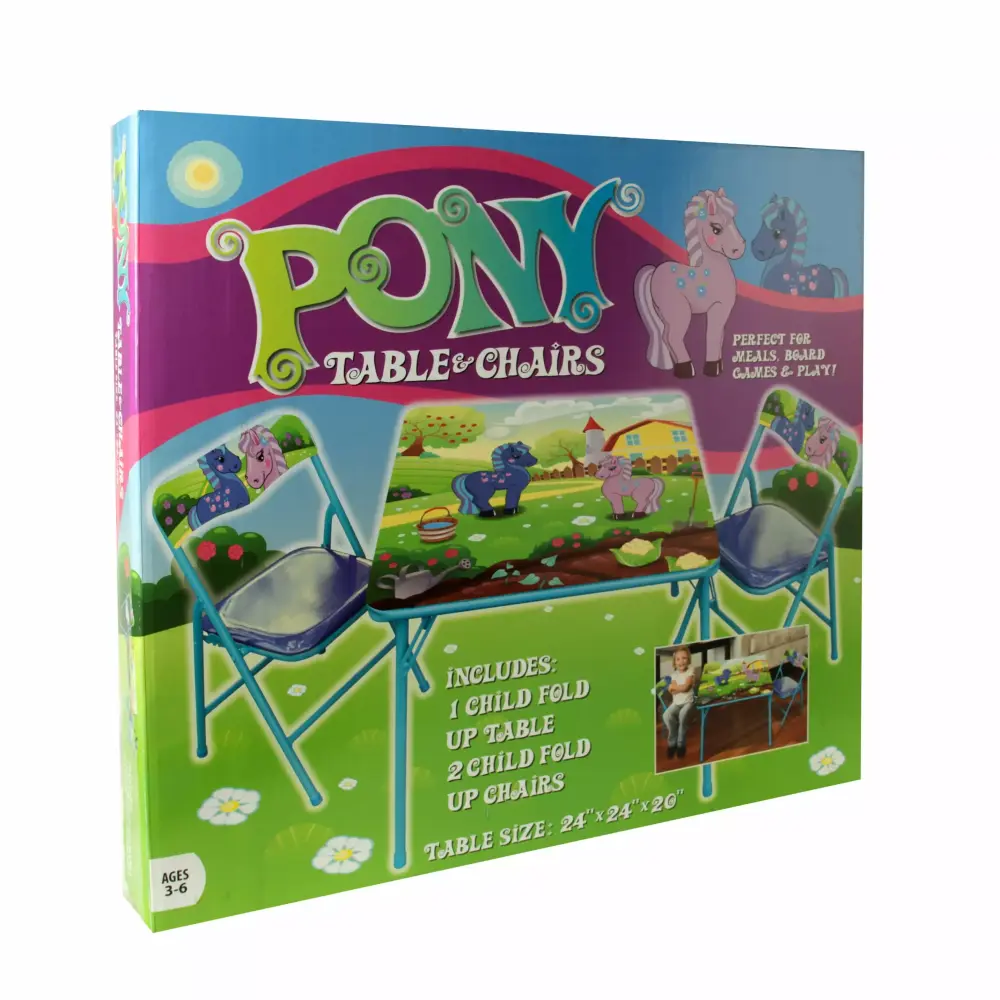 This Gener8 Pony Table and Chairs is the perfect spot for your little one to color. have tea parties. or play pretend. The table features a fun whimsical pony design and is made of metal. plastic. and steel to withstand endless play sessions. You don’t have to worry about safety as the chairs have a Safety Lock feature to prevent tipping. Your Child will love the colorful graphics in light blues. Pinks. Purple and Greens. the design features two ponies in Blue and Pink. The table makes a great addition to a bedroom. or playroom. Perfect fit for snack time. Game Time or even homework. If you are not looking for a Pony Table and Chair set. take a peek at the Barnyard Table and chair set #GS75044. Recommended Ages 3 to 8 Years