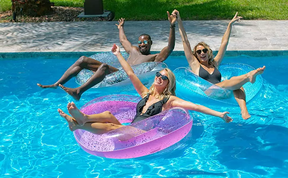 With this sparkling swimming ring. kids love this unique water toy. with bright colors.