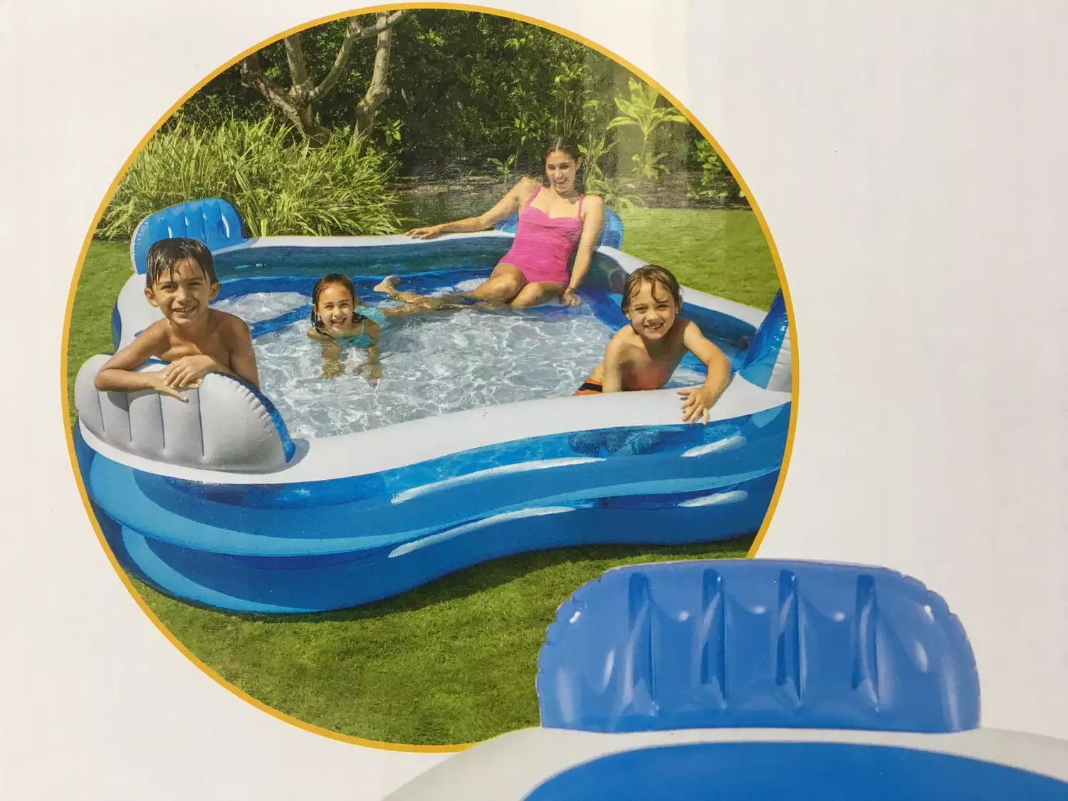 Make a splash this summer while playing in the Intex Swim Center Family Lounge Pool! The unique shape allows for maximum play room and the wide sidewalls give extra comfort and stability. The four built-in seats with backrests are perfect for relaxing and lounging in comfort. Two drink holders are provided to hold your refreshing beverages while lounging. Your family and friends can keep cool and enjoy this fun pool. all summer long! Age grade: 3 and older. Approximate inflated size: 90 L x 90 W x 26 H. Water Capacity: 262 gallons (14 of wall height). Includes: 4 built-in seats with backrests. 2 drink holders.