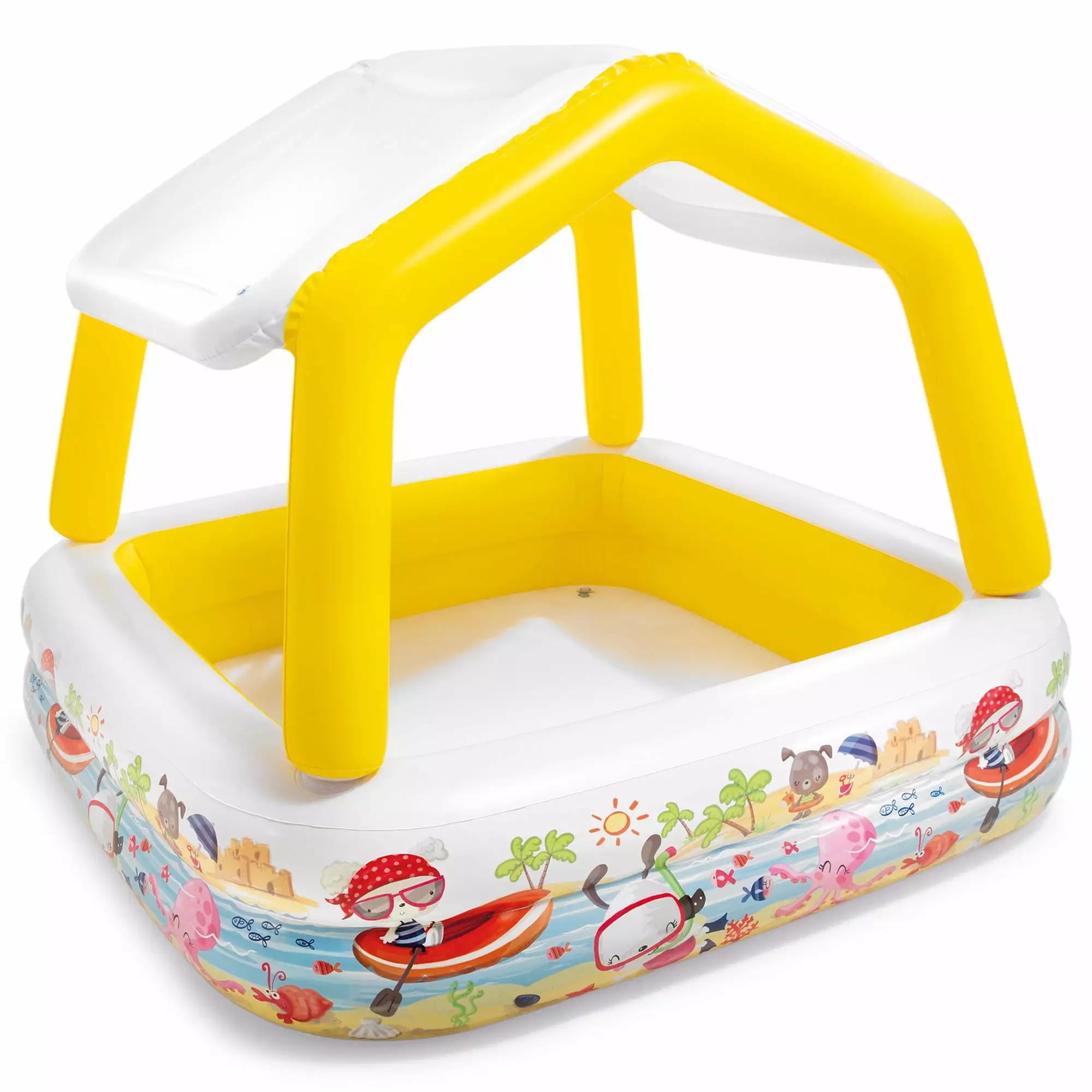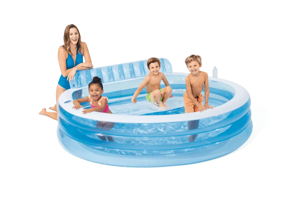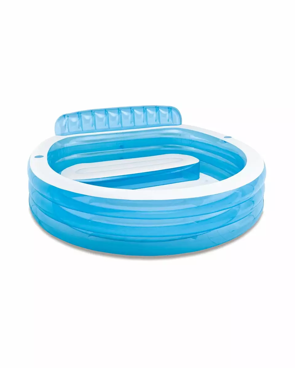 Add some color and style to your backyard with the Intex Above Ground Swim Center Family Lounge Pool. Perfect for splashing and playing. this fun pool is great for keeping friends and family cool all summer long. Parents can get cozy on the built-in-bench while they watch their little ones enjoy the water. Two air chambers. each with a combo valve are included for quick and easy inflation and deflation. This pool is simple and easy to store for enjoyment next season.