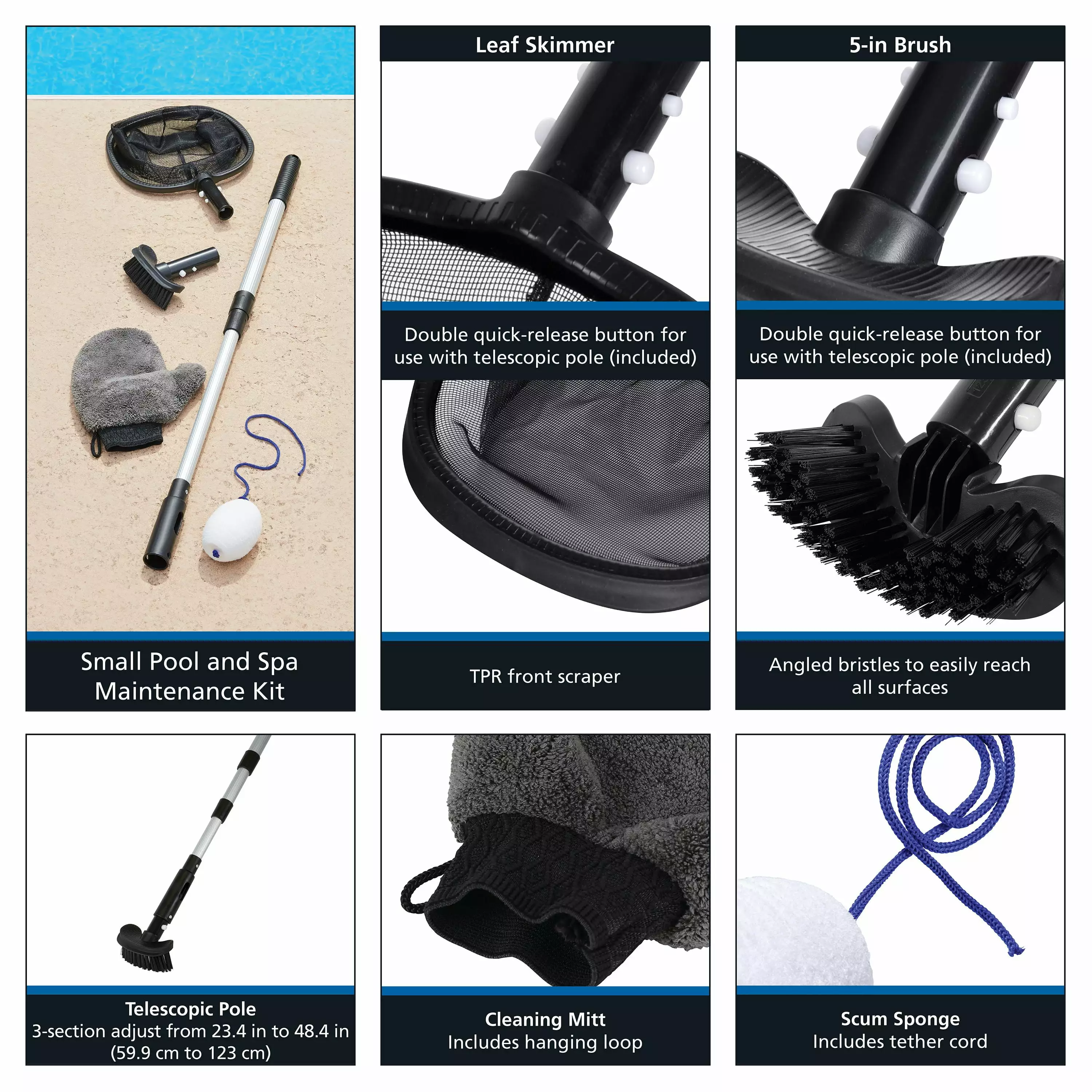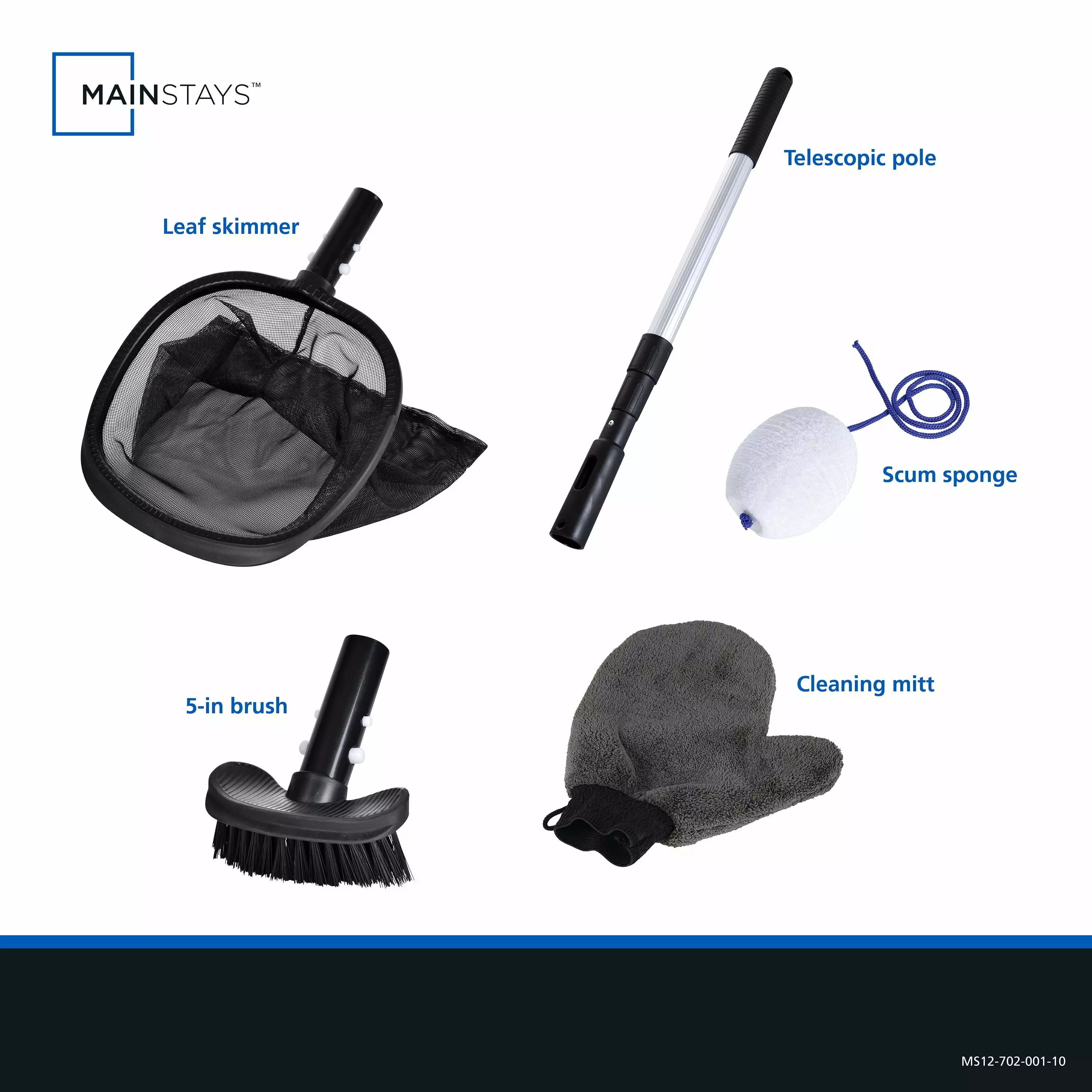 - Mainstays 5-Piece Black & Grey Maintenance Kit for Small Pools & Spas – 1.26 lbs.