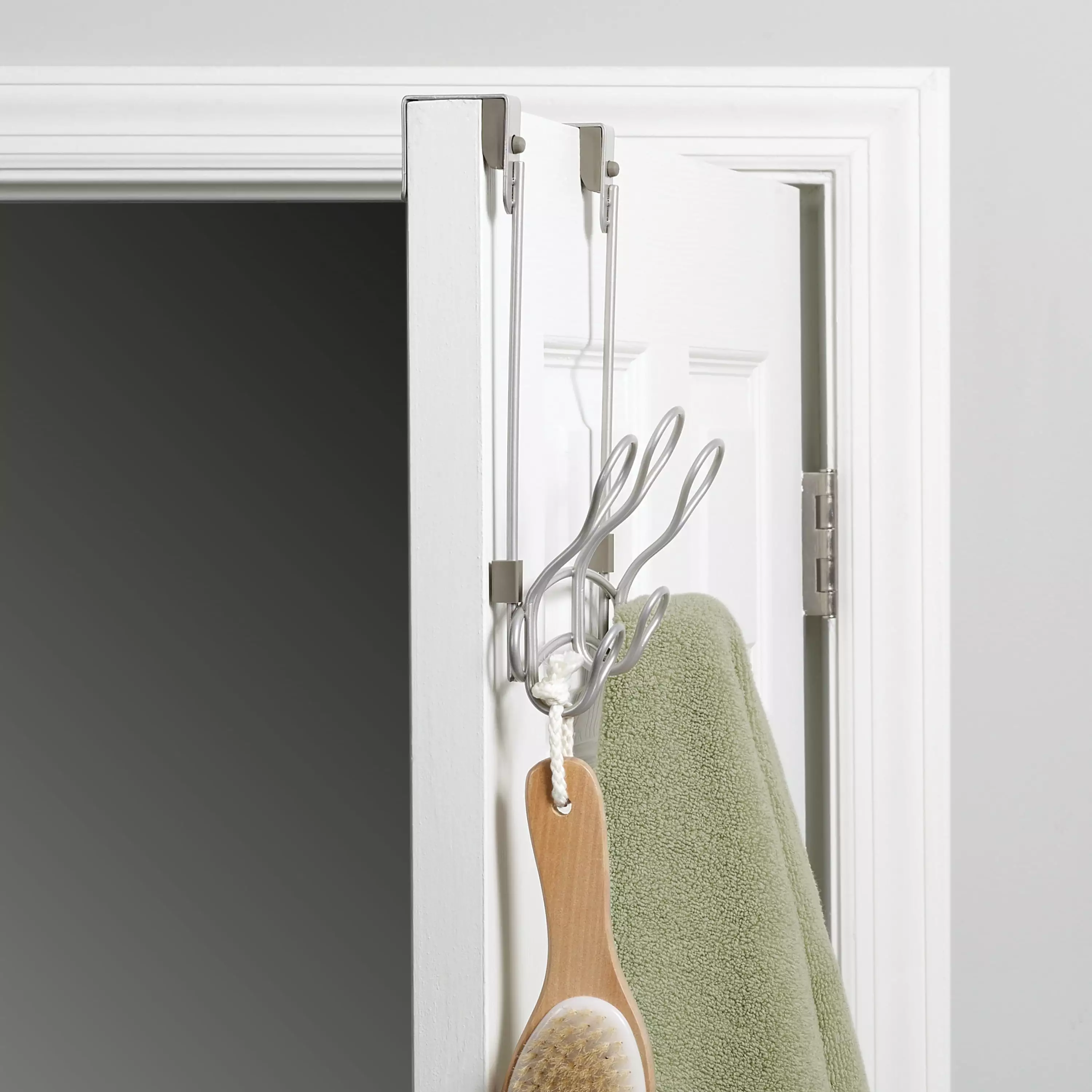 Create hanging storage for towels. robes and more with the Mainstays SnugFit 3-Hook Metal over-the-Door Towel Rack. With its patented SnugFit technology. this over-the-door organizer installs securely over any interior door with no tools needed. The rack includes scratch-resistant spacers and quiet-close bumper guards to protect your door from damage. It features three double hooks (six hooks total). Use it in your bathroom. a closet or anywhere extra hanging storage is needed. The semi-permanent rack has an attractive satin nickel finish and is easy to remove by any adult when needed.