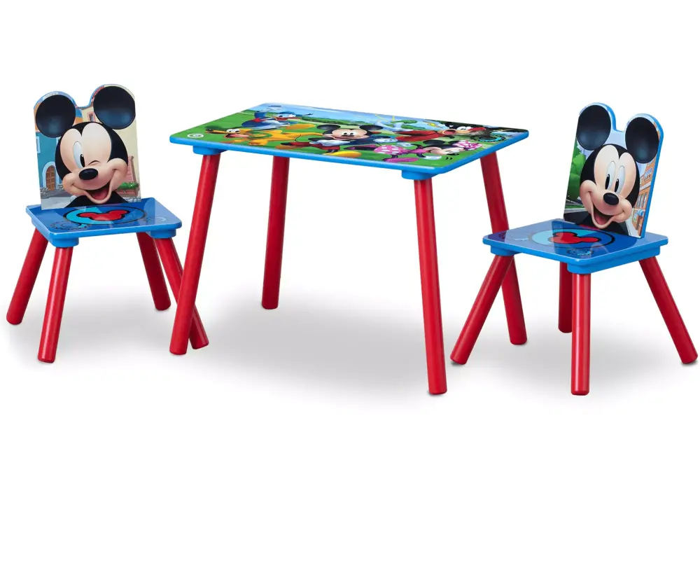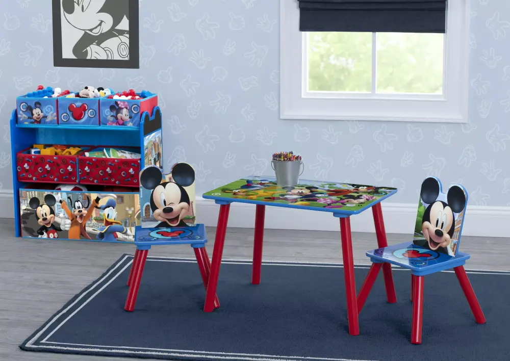 Create the cutest Clubhouse with this Mickey Mouse 4-Piece Playroom Solution by Delta Children. A versatile set that provides both seating and storage. it includes a wooden play table with 2 chairs and a 6-bin toy organizer. The wooden play table and 2 chairs are the perfect kid-size height and feature bold Mickey Mouse graphics. The 6-Bin Toy Organizer features a sturdy wooden frame that holds six fabric bins sized for every type of toy. so you can store books. blocks. and more. The toy bin also comes with reusable vinyl cling stickers that allow your child to decorate the sides themselves. Built from sturdy materials. these pieces will standup to years of playtime.