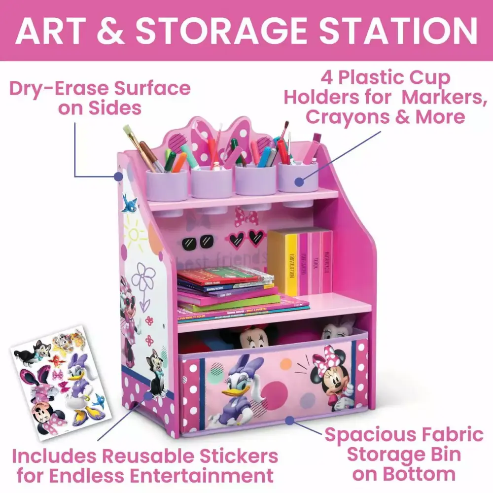 Cater to your little one’s creative side with this Minnie Mouse 3-Piece Art & Play Toddler Room-in-a-Box by Delta Children! A versatile set covered in lovable Minnie Mouse graphics makes it easy for kids to draw. paint. play and learn. while at the same time develop imagination. creativity and hands-on ability. This all-in-one art and play solution includes a Draw & Play Desk. Art & Storage Station and Fabric Toy Box.