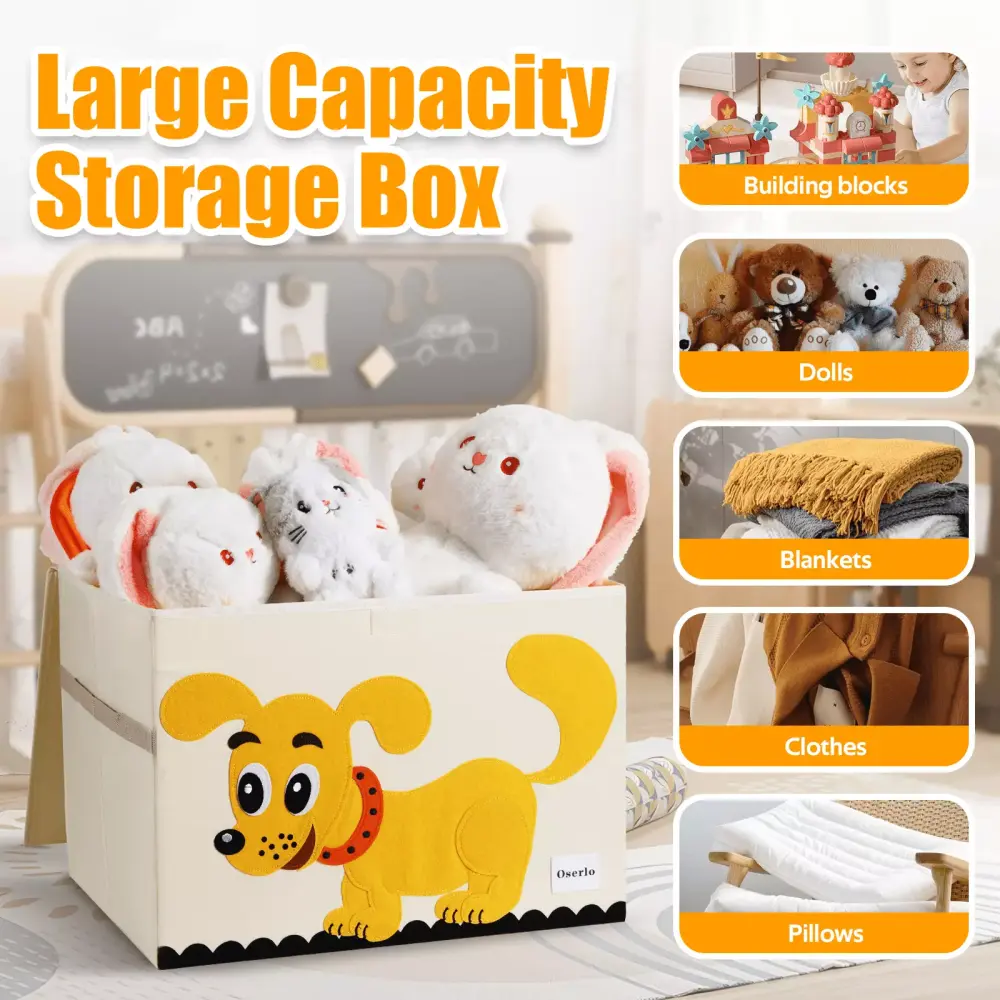 Oserlo toy box with lid is made of washable oxford cloth material. no need to worry about getting dirty and no way to clean it. it can be washed and reused. These toys boxes have a plastic plate in the middle sufficient supporting force. not easy to deform. There are widened mentions on both sides hand. easy to move without tightness. You can use it to store toys. clothes. books. etc. It has a wide range of uses. The cover of the large toy chest is non-removable and has velcro. which can prevent dust and dirt and moisture-proof. After you receive the toy storage box. you only need to unfold the toy storage chest and put it into the bottom plate to use it. which is very convenient. Simply fold it up when you don’t need it.