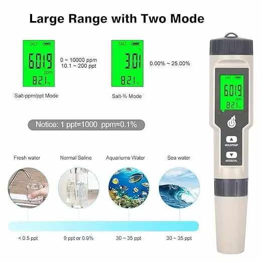 - Wide range of applications: The salinity tester has a variety of applications. The instrument can not only test the salt content of table salt. salt water pools and koi ponds. but also test the salinity of seawater. oceans and salt water fish tanks.