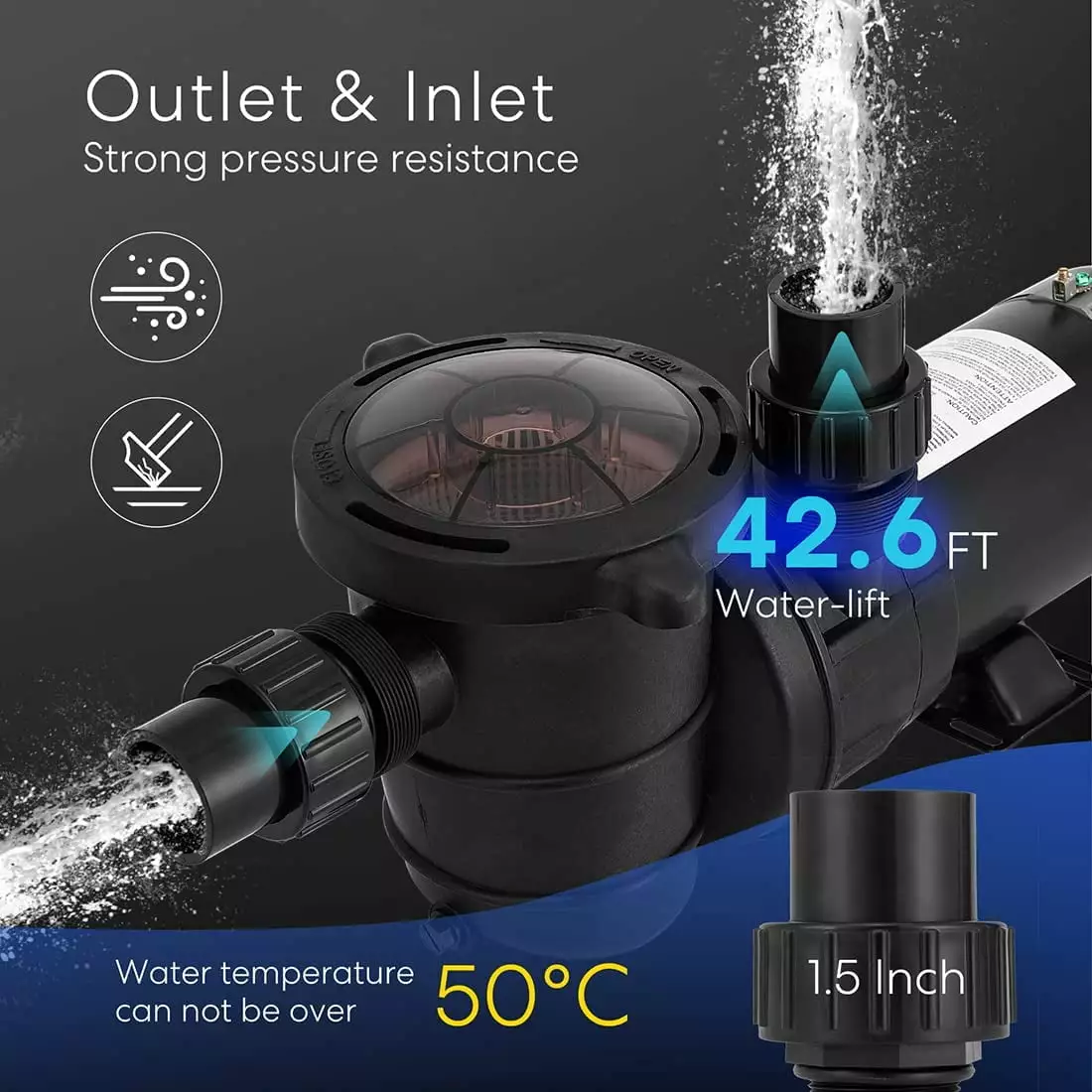 WIDE APPLICATIONS – Female thread and slip union connection for tool-free installation; Suitable for swimming pools. hot tubs. thermal springs. spas and irrigation system. but should not to be used with storable pools; Package includes: 1 x pool pump; 2 x black interface. 1 x manual