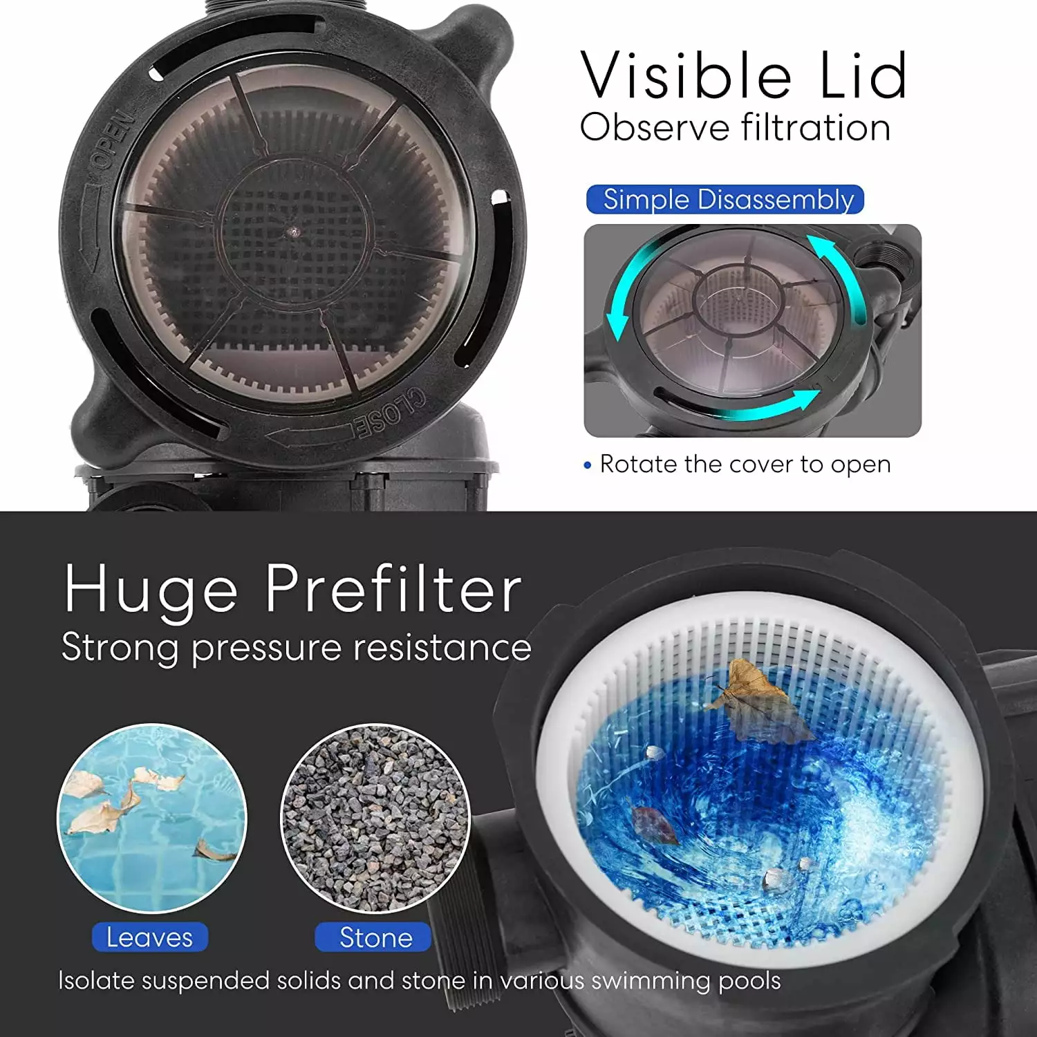 DETAIL ORIENTED – The strainer is designed with an extra-large filter basket that is detachable for easy cleaning; See -through lid allows you a clear internal viewing; Built-in automatic thermal overload protector and airflow ventilation protects from overheating and damage; Note: Please fill the pump with water upon first use to prevent the motor from overheating