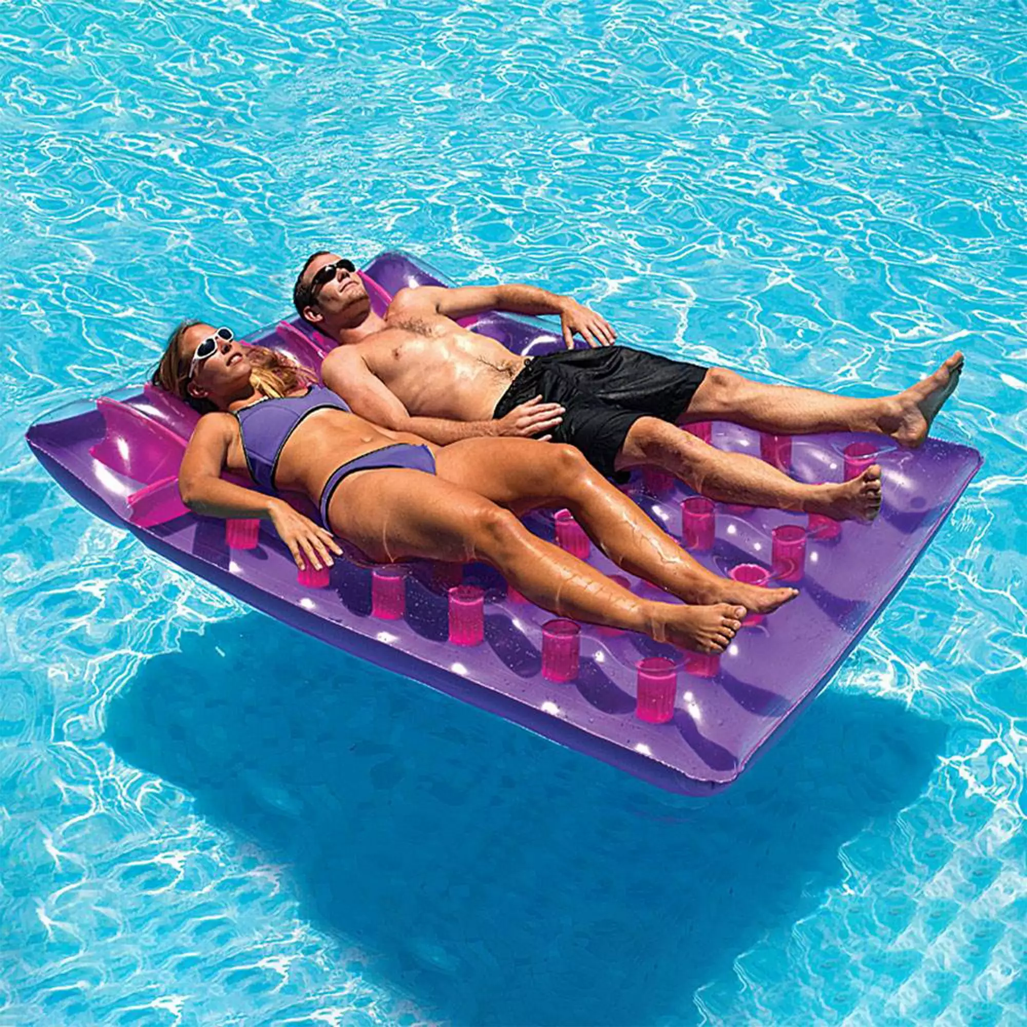 Double the fun when you invite a friend to float with you on this double pool raft. Relax with a friend on this 78" X 56" (198 cm x 142.2 cm). 36-Pocket inflatable dual mattress from Swimline! The only thing better than spending an afternoon floating in the pool is doing it together! Talk with a friend. cuddle with your spouse or hang out with your child. There is no wrong way to let this French style pool mattress bring you together! But don’t forget the sunscreen because once you try out this Swimline favorite. You may never want to get off the dual pool raft! Made with high-quality vinyl with radio frequency (RF) welded Seam construction for maximum durability and easy inflate valves that will get you in the water faster.