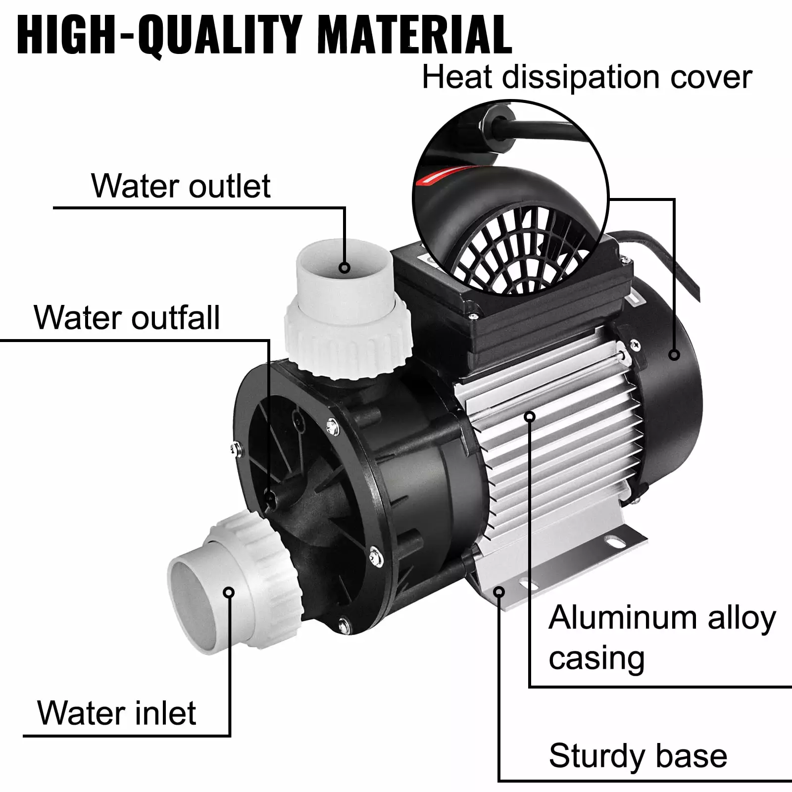 This swimming pool pump is made of high-quality aluminum alloy and thermoplastic. rustproof. and corrosion-resistant for durability.