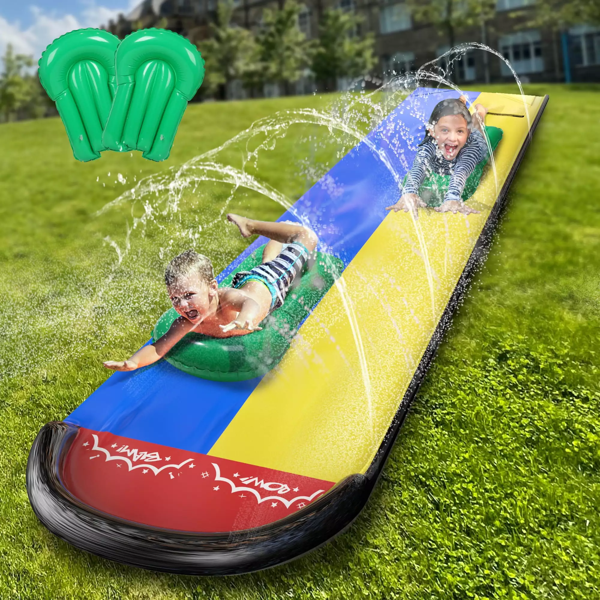1??Water skiing. sliding and sprinklers in one!It is about 472cm / 185.8in long and 75cm / 29.5in wide. 2??Ultra-long water slide. with sawtooth spray mode sprinkler system. long sliding length. achieving excellent water coverage effect. 3??Easy to assemble. connect the water slider to the garden hose. bringing hours of splashing fun. 4??Suitable for hot summer family activities. birthday gifts. parties. games. lawn and garden toys. etc. 5??High quality PVC material manufacturing ensuring maximum durability.