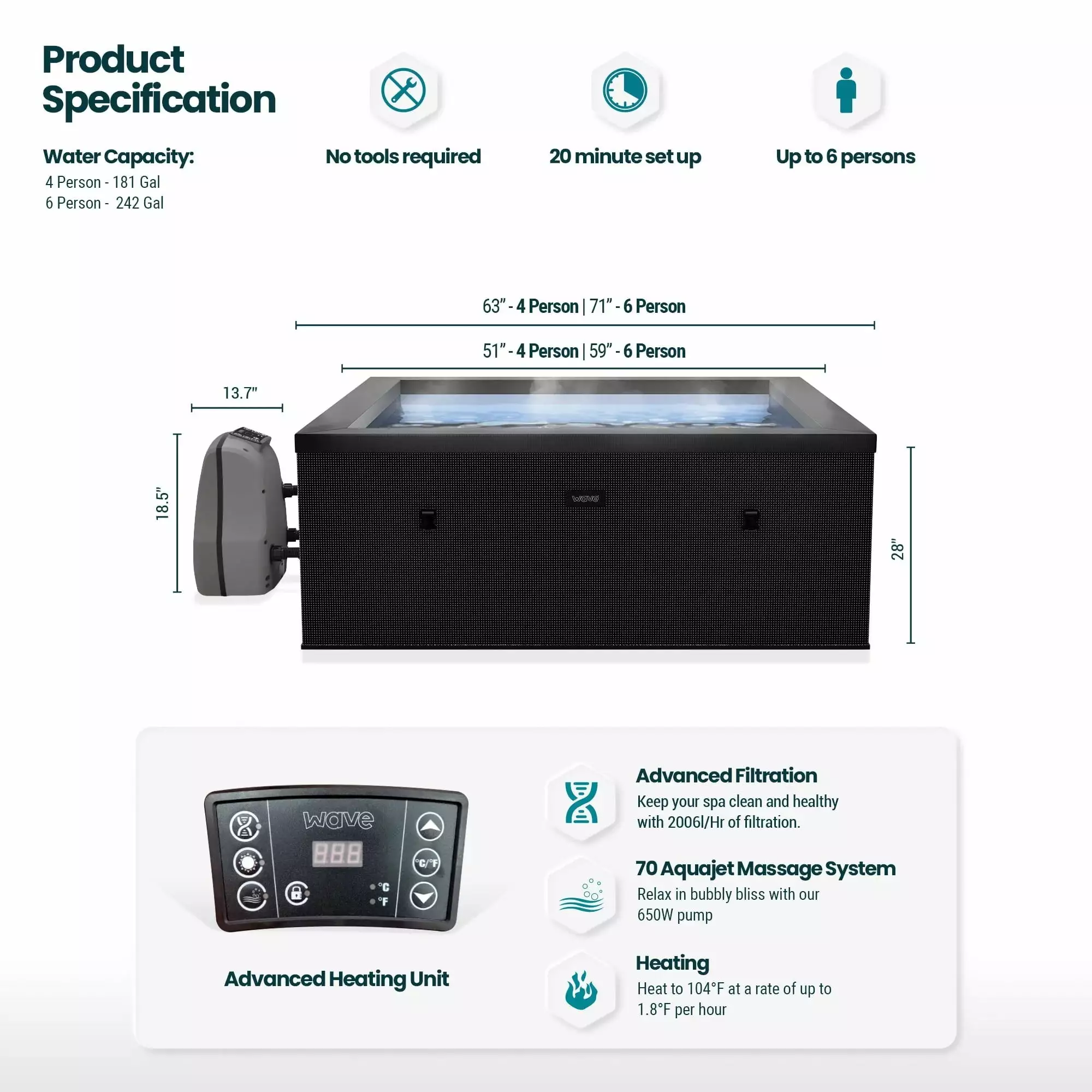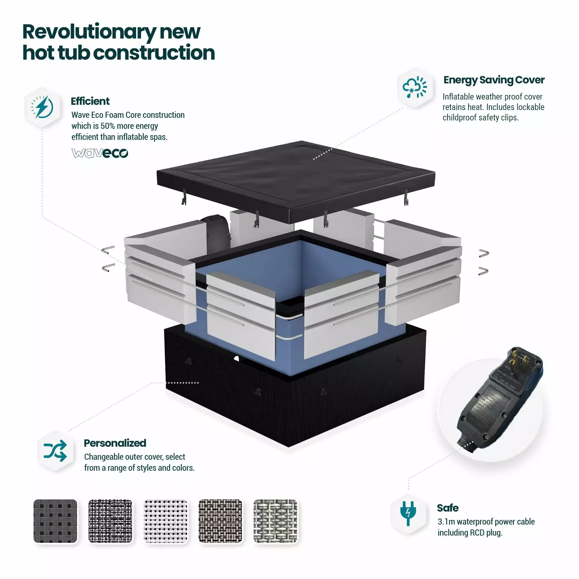 Wave Garda Eco Foam Hot Tub – 104F Rapid Heating System. Up to 50% More Thermally Efficient. 70 Aqua Jet Massage System Spa Bath. Insulating Cover. Tub for 4 People (Charcoal Black)