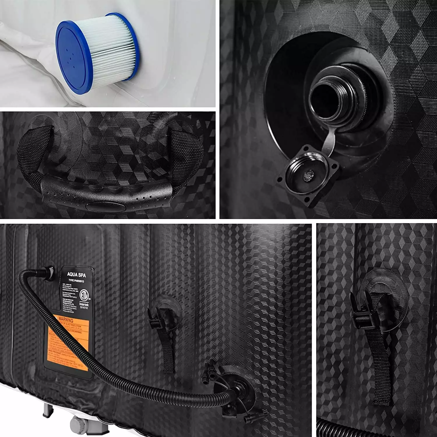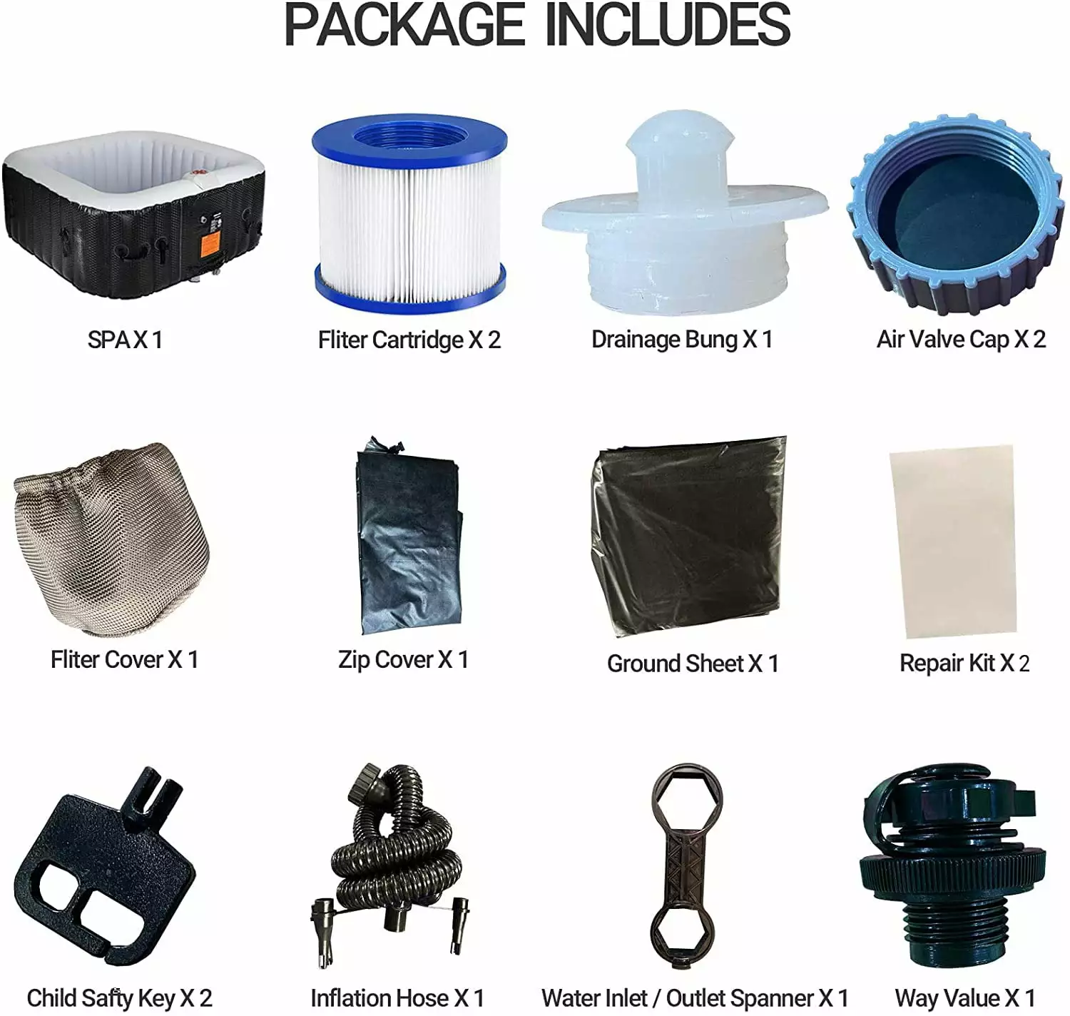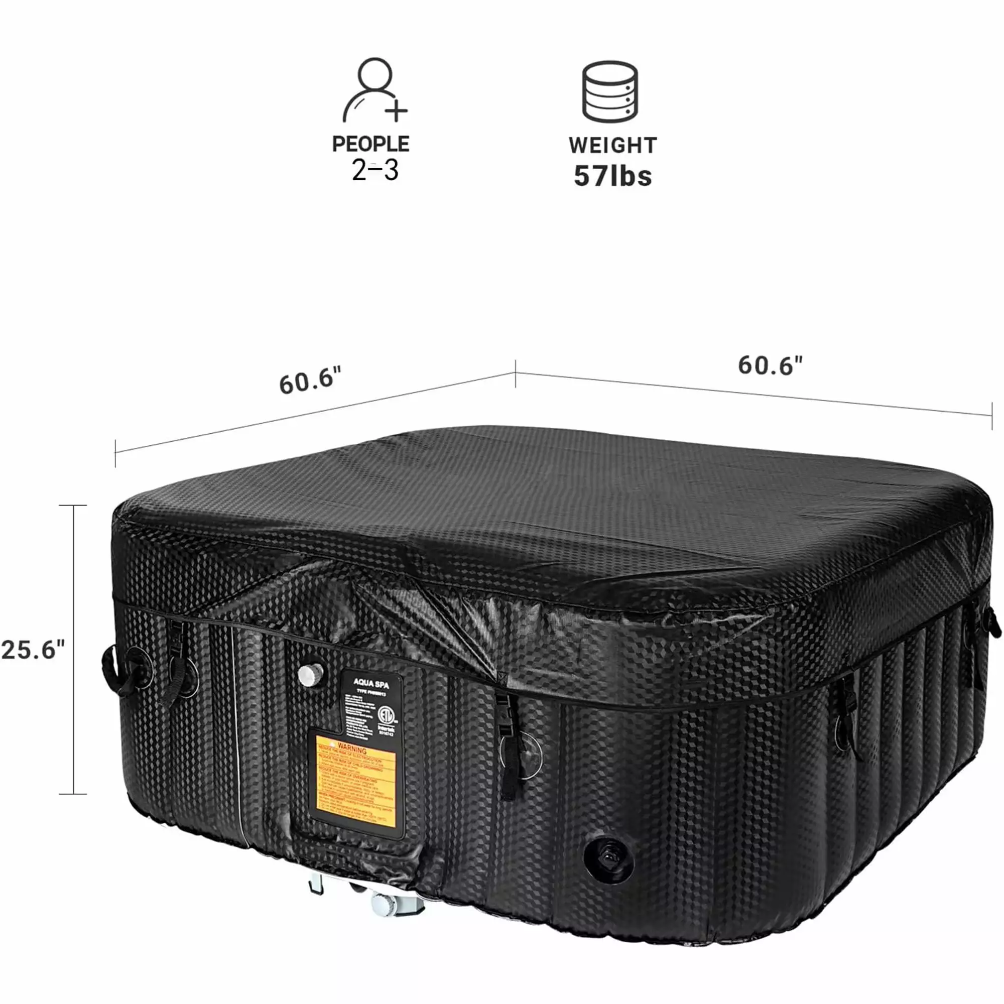 Product details Quality and fun The puncture-resistant material and construction ensures your hot tub never loses its shape and stability Relax at the touch of a button with the 73X73X25massage. 130 surrounding air jets. automatic preheating and integrated water filtration. Material of Spa: PVC Water capacity??910L/240Gal Gross Weight: 64 lbs Power: 110-120 V Largest Bear: 210 kg / 462 lbs Temperature Heats:68?H-104?H/20??-40?? Count Per Pack:1 Seating Capacity: 4-5 Package includs: 2 x Filter cartridge. 1 x zip cover.1 x way valve. 2 x air valve cap. 2 x repair kit.1 x inflation hose.2 x child safty key. 2 x filter cover. 1 x water inlet / outlet spanner.1 x ground sheet.