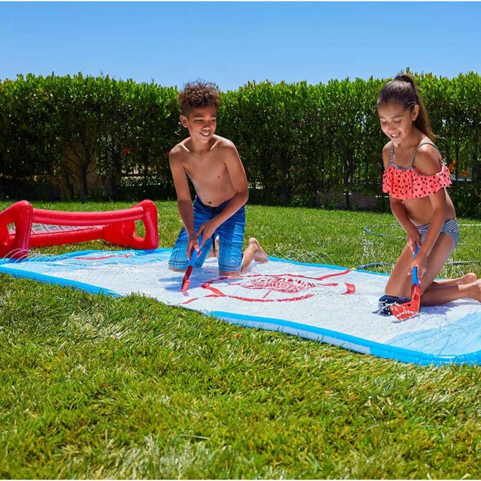 Get ready to enjoy the most enjoyable outdoor water fun because this water knee hockey set from Wham-O will turn your backyard into a haven of splashy excitement! Experience the thrill of sliding and scoring goals while staying cool under the double waterfall feature. Perfect for kids aged 5-12. this backyard hockey goal set promises hours of exhilarating entertainment in the sun. With two inflatable goals. two hockey sticks. and one inflatable puck included. the fun never stops. Whether it’s a birthday party. family gathering. or just a day of outdoor play. the Slip N Slide Water Knee Hockey is sure to be a hit.